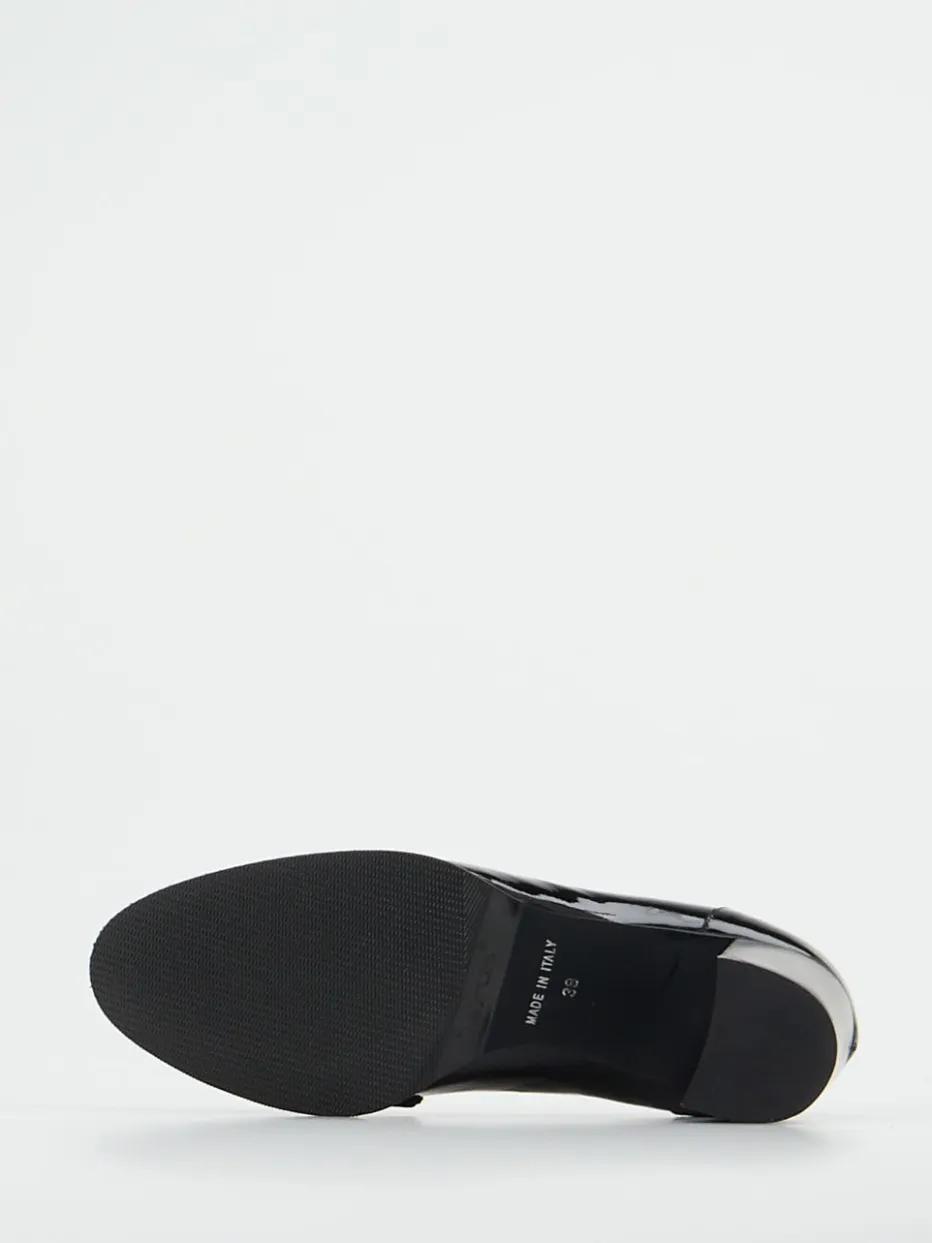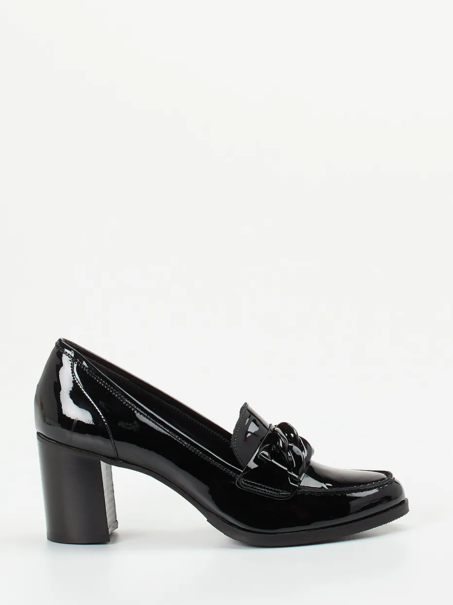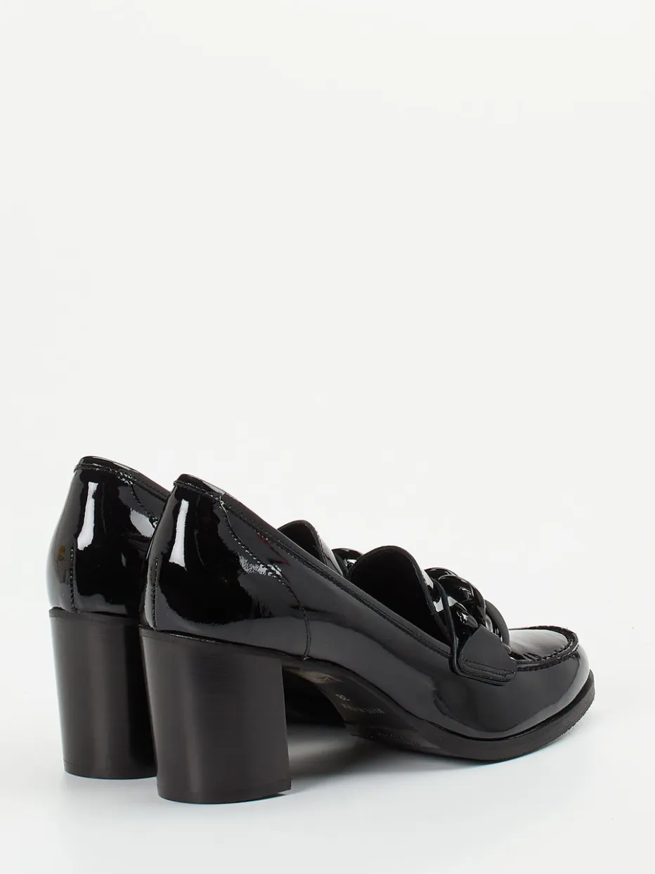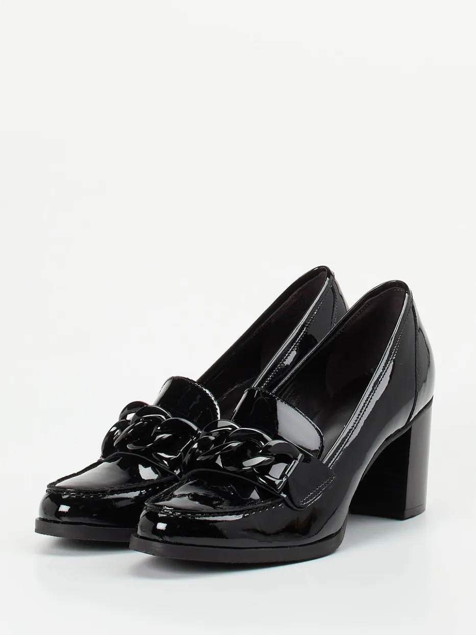 Glanzvolles Statement für stilbewusste Looks.Mannori interpretiert den klassischen Damen-Loafer als hochwertigen Blockabsatz-Pumps aus schwarzem Lackleder. Ideal für lange Büro- oder Eventtage sorgt das gepolsterte Lederfußbett gemeinsam mit der flexiblen Gummisohle für angenehmen Komfort. Das glatte, hochglänzende Lackleder kommt in Uni-Schwarz und wird durch eine breite, tonale Kettenapplikation akzentuiert. Der 6 cm hohe Holzblockabsatz und die leicht eckige Zehenlinie verleihen dem Design Vintage-Charme mit modernem Twist – inspiriert vom Quiet-Luxury-Trend. Perfekter Stilpartner für Businesshosen oder fließende Midikleider. Ein charakterstarkes Modell mit klarer Formsprache und edler Materialästhetik.
