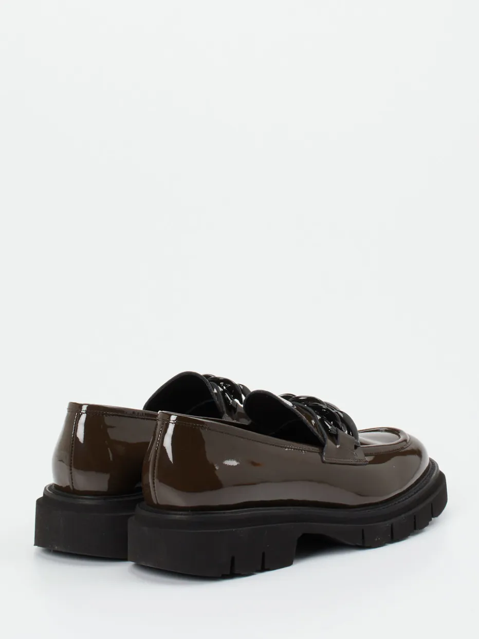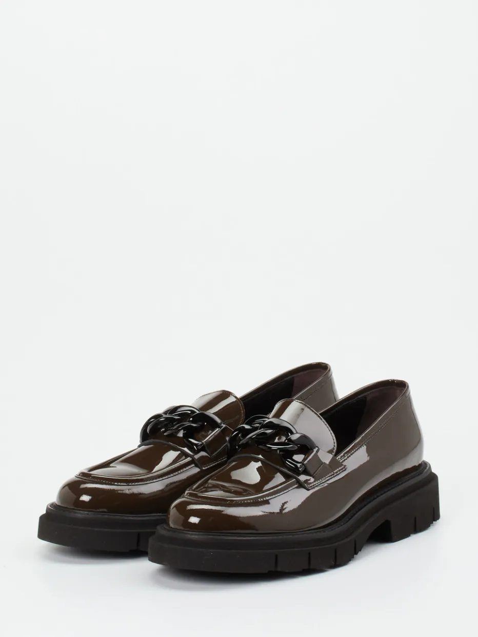 Eleganz im Chunky-Look.Die Marke Mannori präsentiert einen stilvollen Loafer mit markantem Profil. Ideal für urbane Looks mit Trendfaktor: Das Modell aus schokobraunem Lackleder zeigt sich mit glänzender Oberfläche, klassischer Silhouette und auffälliger schwarzer Gliederkette. Die breite Gummisohle mit 3 cm Absatzhöhe sorgt für stabilen Auftritt, das Futter aus Ziegenleder für angenehmen Komfort. Das Design greift aktuelle Chunky-Trends und den Look glänzender Statement-Schuhe auf. Stilvoll kombinierbar mit Midi-Strickkleidern oder feinen Tailoring-Teilen. Ein Mode-Statement mit eleganter Haltung und solidem Komfortanspruch.