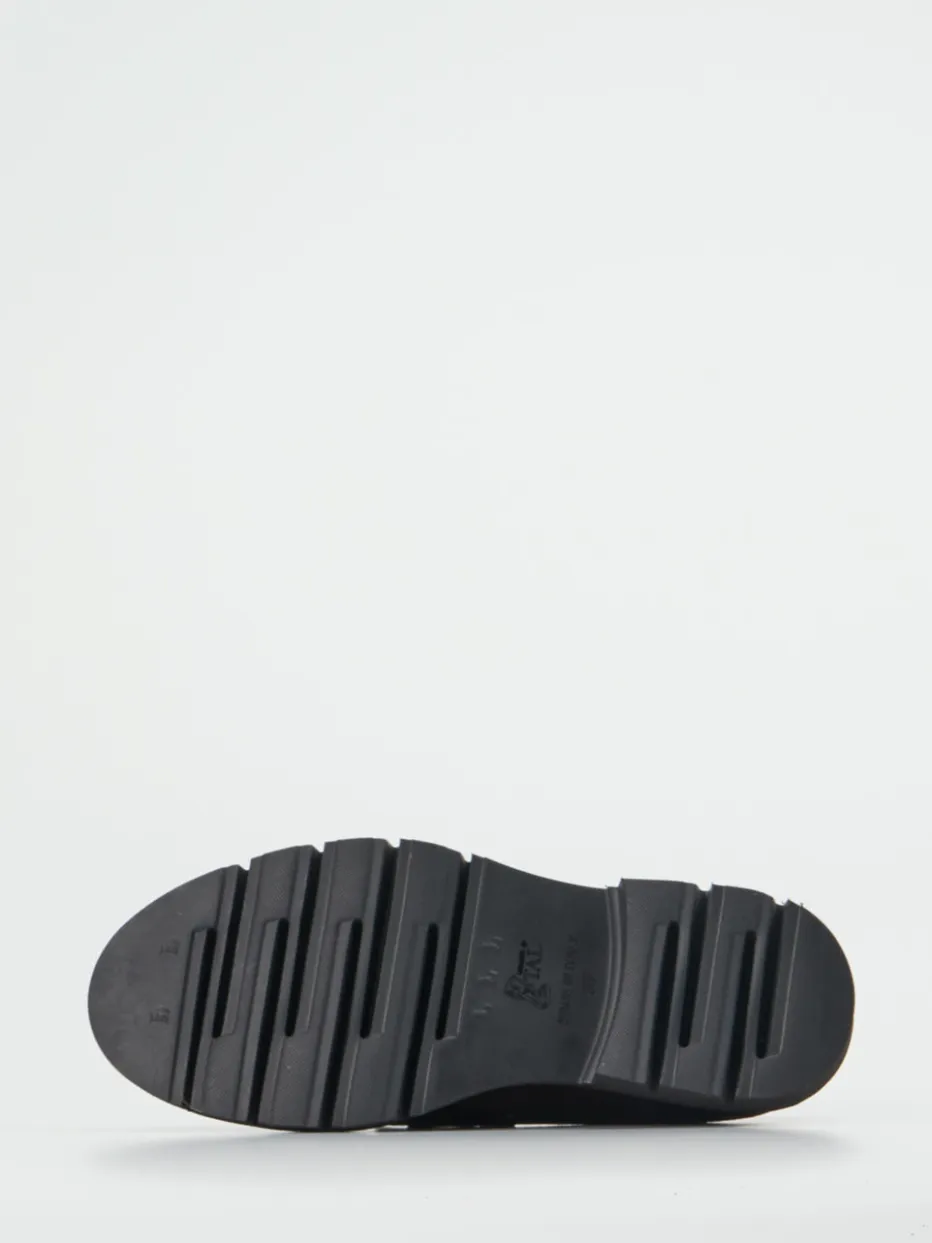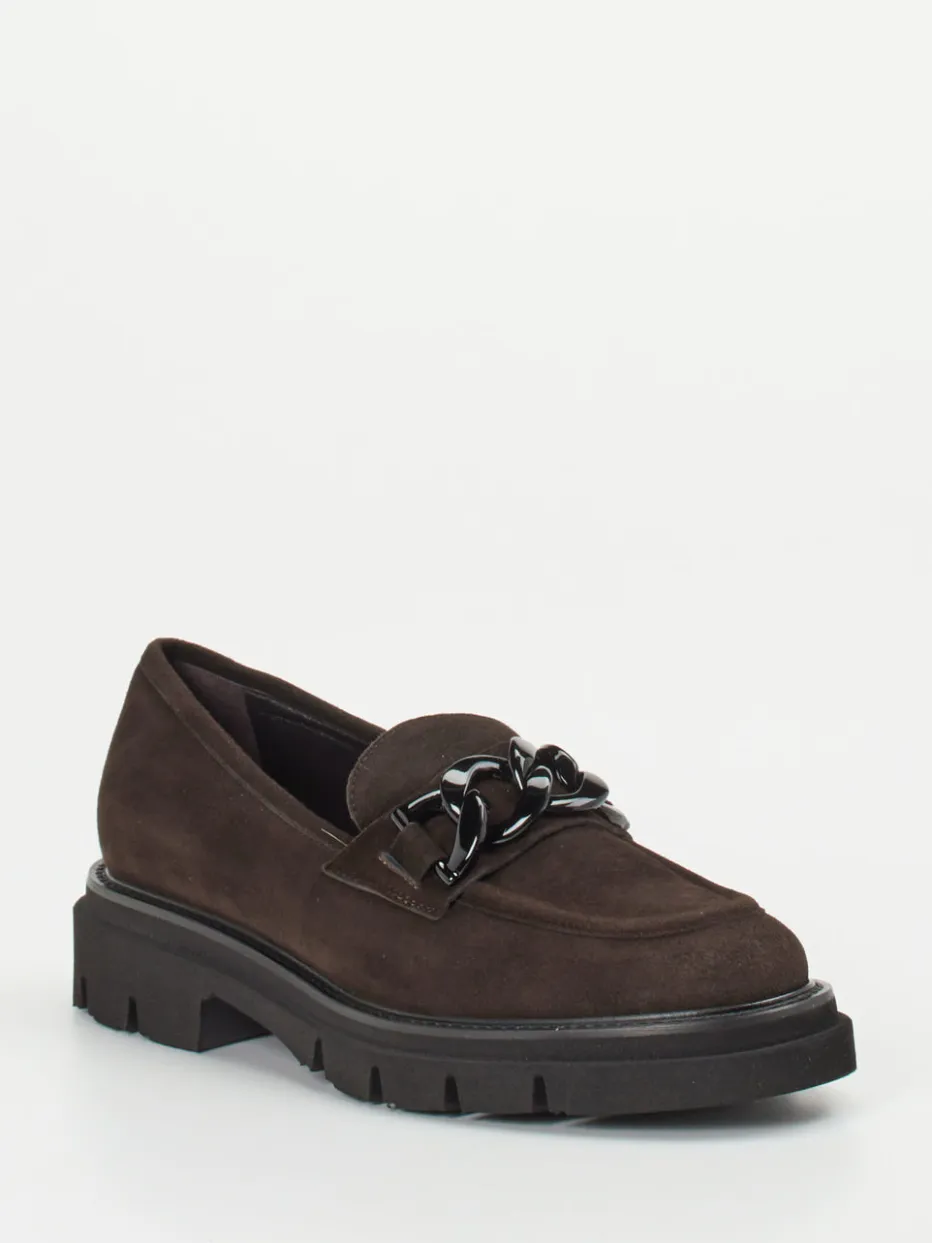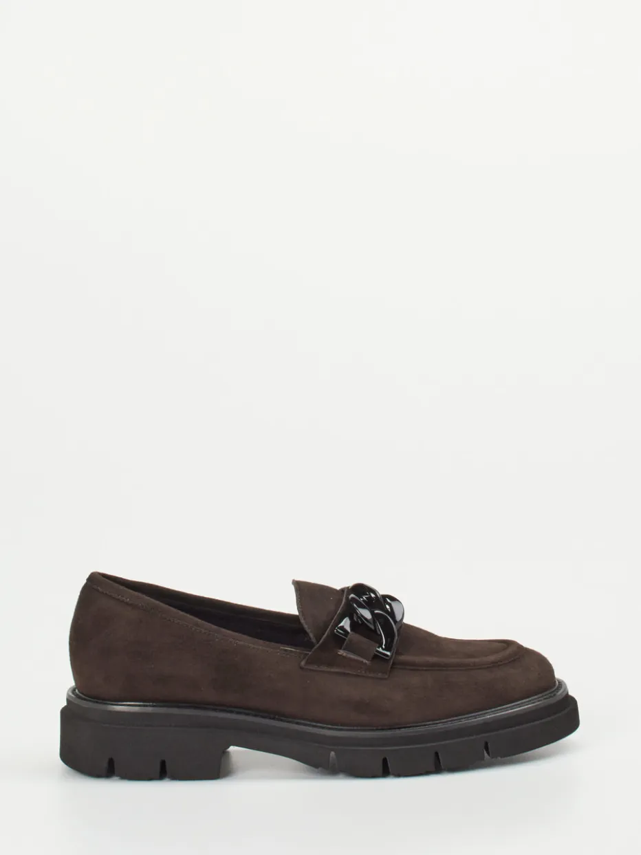 Statement für urbane Eleganz.Dieser Damen-Chunky-Slipper von Mannori überzeugt mit ästhetischer Klarheit und hohem Komfort. Kaffeebraunes, samtig angeschliffenes Veloursleder trifft auf eine markante Profilsohle und eine dekorative Gliederkette in Schwarz. Die Schlupfform und das weiche Lammnappa-Futter bieten ausgezeichneten Tragekomfort im Alltag oder Business-Umfeld. Die Leichtzellsohle sorgt für visuelle Balance und Funktionalität. Der Schuh greift den Chunky-Loafer-Trend auf und integriert sich stilsicher in moderne Minimalismus-Looks. Besonders harmonisch wirkt die Kombination mit Cropped-Hose und Naturtönen. Ein puristischer Begleiter mit modischer Substanz – typisch Mannori.