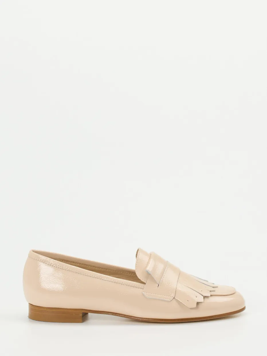 Dieser klassische Loafer von Mannori vereint glänzendes Lackleder mit markanter Fransenapplikation in dezenter Beigenuance – ein stilvolles Beispiel für den Minimalismus des Quiet Luxury Trends.