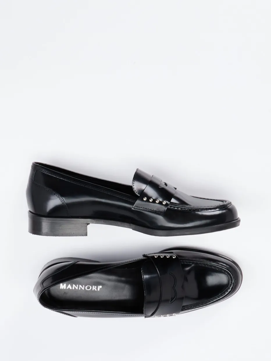 Schlichte Eleganz für stilvolle Auftritte.Der Damen-Loafer von Mannori vereint anspruchsvolles Design mit hochwertigen Materialien. Ideal für Tage mit Business-Meetings oder Abendessen in stilvollem Ambiente: Dieses Modell aus schwarzem Hochglanzleder zeigt eine klassisch-langgezogene Silhouette mit schlanker Spange, Mokassinnaht und feinen silberfarbenen Nieten. Das glänzende Finish unterstreicht die Ästhetik des Quiet-Luxury-Trends. Der komfortable Leisten, das Ziegenlederfutter und das gepolsterte Fußbett garantieren Tragekomfort bei gleichzeitiger Eleganz. Dazu passt eine schwarze Hose oder ein Midirock im cleanen Look. Ein Loafer mit hochwertiger Verarbeitung und moderner Raffinesse – ganz im Zeichen urbaner Klassik.
