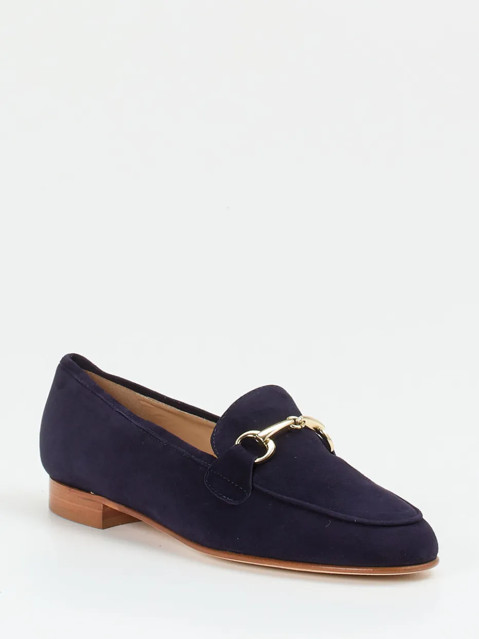 Der Loafer von Mannori überzeugt mit samtigem Veloursleder in Dunkelblau und einer eleganten goldfarbenen Spange – ein idealer Begleiter für stilvolle Office-Looks mit subtilem Luxusanspruch.