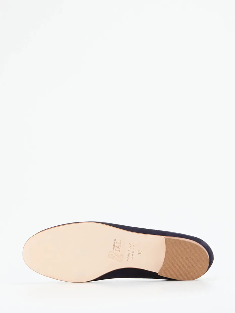 Dezente Eleganz für Office und Alltag.Dieser Damen-Slipper von Mannori zeigt sich als klassischer Loafer in hochwertigem Veloursleder. Ideal für gepflegte Alltagskombinationen oder als Akzent im Business-Outfit überzeugt das dunkelblaue Modell durch sein mattes Finish und eine markante, goldfarbene Trensenspange. Die flache Silhouette und die softe Ledersohle bieten angenehmen Komfort, während das Lammnappa-Futter den Trageanspruch abrundet. Das Design orientiert sich an preppy-minimalistischen Einflüssen und passt ideal in die Stilwelt von „Quiet Luxury“. Kombinierbar mit Blazer oder Lederhandtasche in Cognac. Mannori verbindet zeitlose Formensprache mit hochwertiger Materialwahl.
