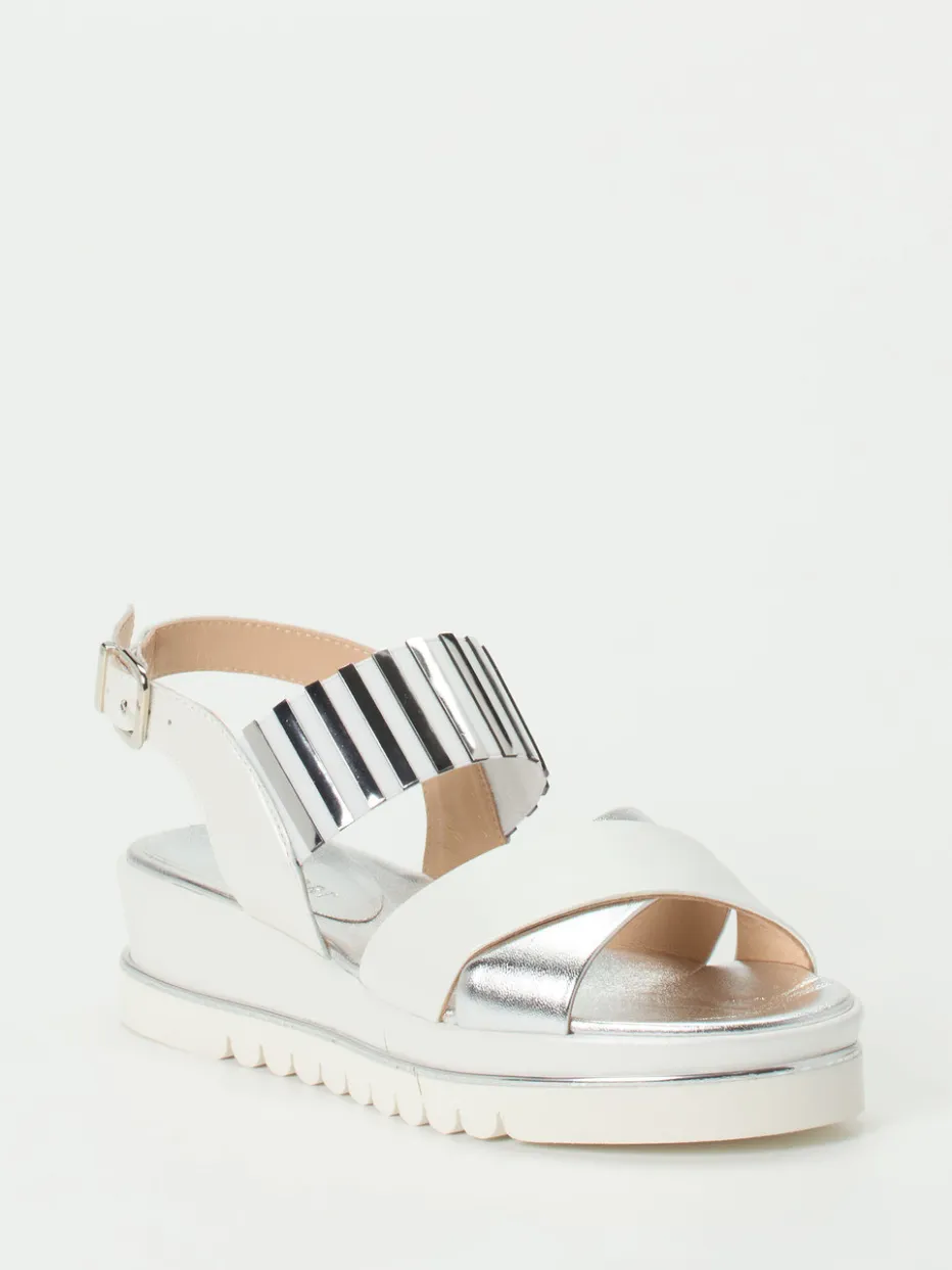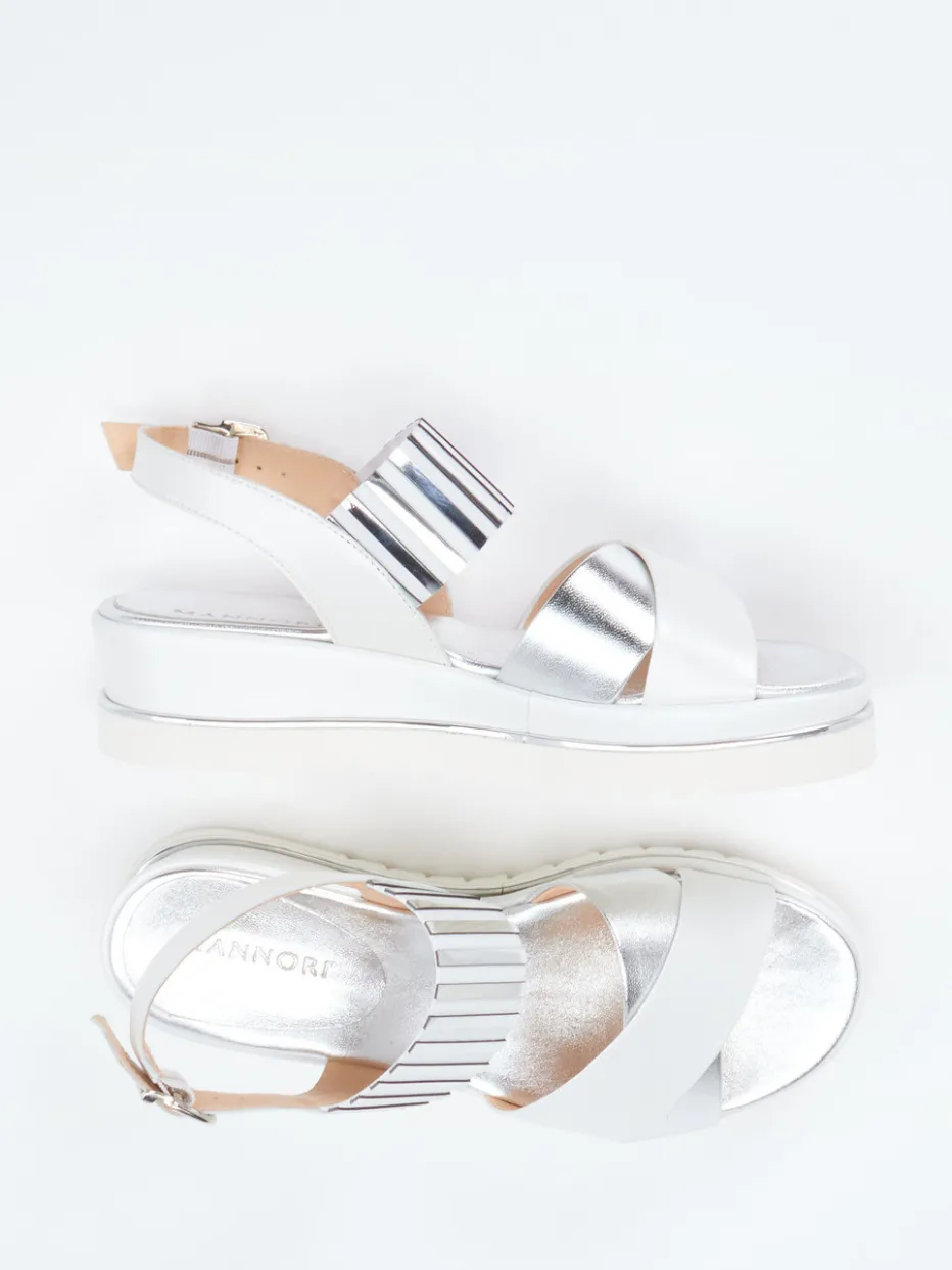 Sommerstil mit Metallic-Finesse.Die Marke Mannori präsentiert modische Plateau-Sandalen für Damen. Ideal für sommerliche Stadtbummel oder Urlaubsausflüge bieten diese Sandalen aus silberfarbenem Metallicleder in Kombination mit weißem Glattleder und glänzender Oberfläche einen stilvollen Auftritt. Charakteristisch ist das gestreifte Elastikband über dem Rist mit silberfarbenen Applikationen, das in Verbindung mit der verstellbaren Schnalle für Komfort und sicheren Halt sorgt. Die profilierte Gummisohle mit 3 cm Plateau und silbernem Akzentstreifen verleiht urbane Präsenz. Inspiriert von Minimalismus und Metallic-Trends unterstreichen sie einen trendbewussten Streetwear-Look. Markentypisch vereint Mannori feinste Materialien mit modischer Aussagekraft.