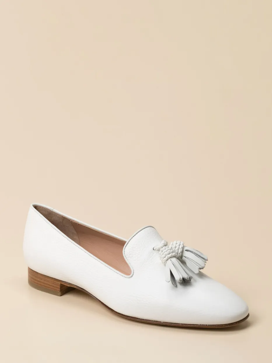 Dieser Loafer vereint hochwertiges Kalbleder mit klassischem Chic. Die tonalen Quasten und der flache Absatz in Holzoptik greifen den aktuellen Quiet-Luxury-Trend gekonnt auf.