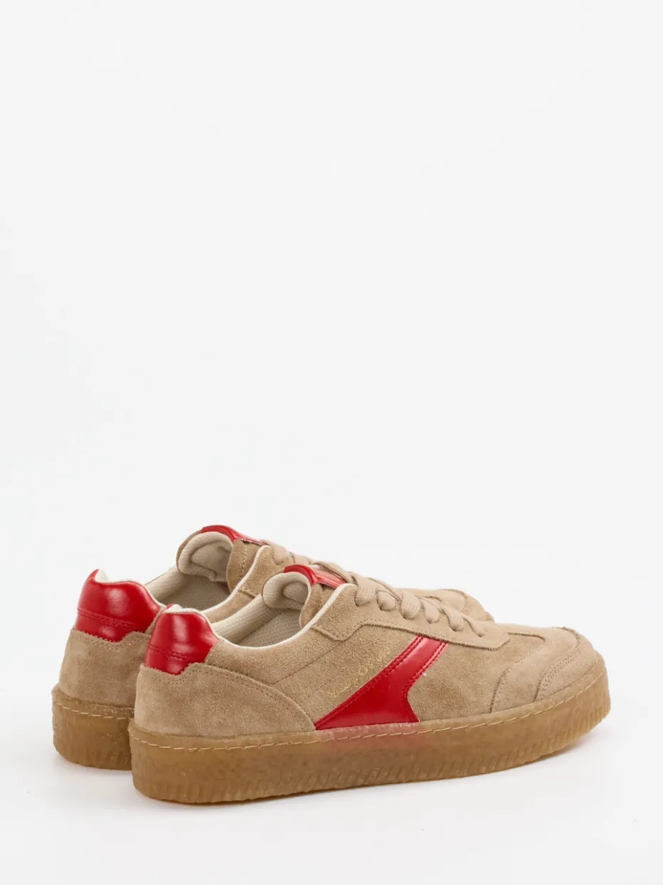 Vintage-Flair neu interpretiert.Marc O’Polo präsentiert einen Retro-Sneaker für den Alltag mit stilbewusster Attitüde. Die Kombination aus beigebraunem Veloursleder, samt weicher Narbung, und signalroten Glattleder-Patches erzeugt einen modischen Kontrast. Die flach-klassische Silhouette mit rotem Fersenpatch, goldfarbener Logoprägung und Schnürung lässt Streetwear-Vibes der 90er stilvoll aufleben. Die profilierte Gummisohle in Kreppoptik sorgt für Trittsicherheit, das atmungsaktive Mesh-Innenfutter und das Wechselfußbett aus Memory-Foam für hohen Komfort. Ideal im urbanen Kontext und zur Kombination mit Relaxed Fit Denim. Unkomplizierter Style – souverän umgesetzt von Marc O’Polo.