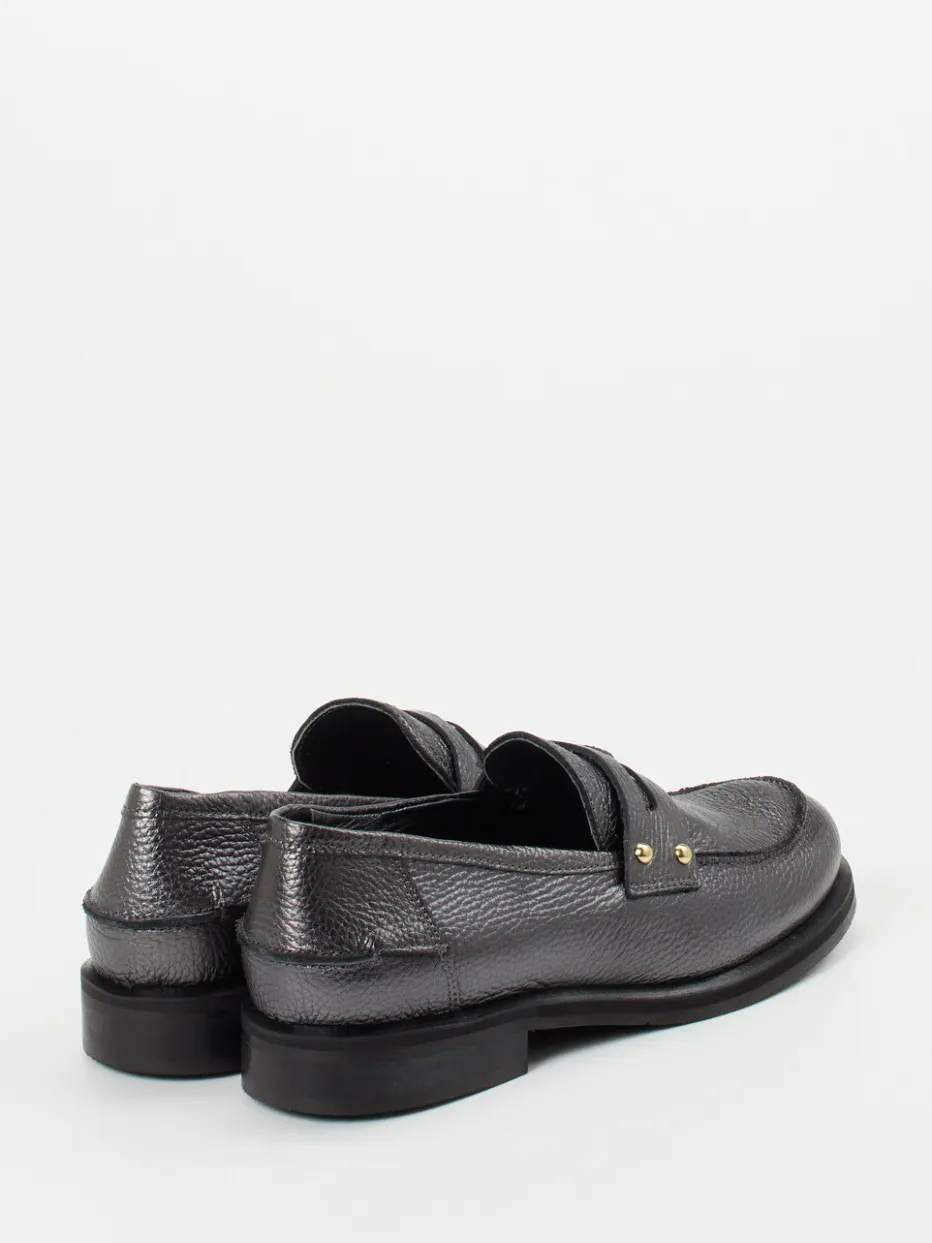Für Tage, an denen Komfort und Stil gleichermaßen gefragt sind, bietet dieser Schuh mit seinem samtig genarbten Kalbleder in graphitgrauem Metallic-Finish eine ideale Lösung. Die flache Silhouette, ein flacher Blockabsatz und der Schlupfeinstieg betonen seine Alltagstauglichkeit. Den Retro-Charme eines Penny Loafers greift die geschlitzte Spange mit eingelegter Ziermünze gekonnt auf. Goldfarbene Metalldetails greifen den Metallic-Trend auf und verleihen dem Modell einen spannenden Twist. Harmoniert hervorragend mit schmalen Stoffhosen oder Blazern für ein stilvolles Büro-Outfit.