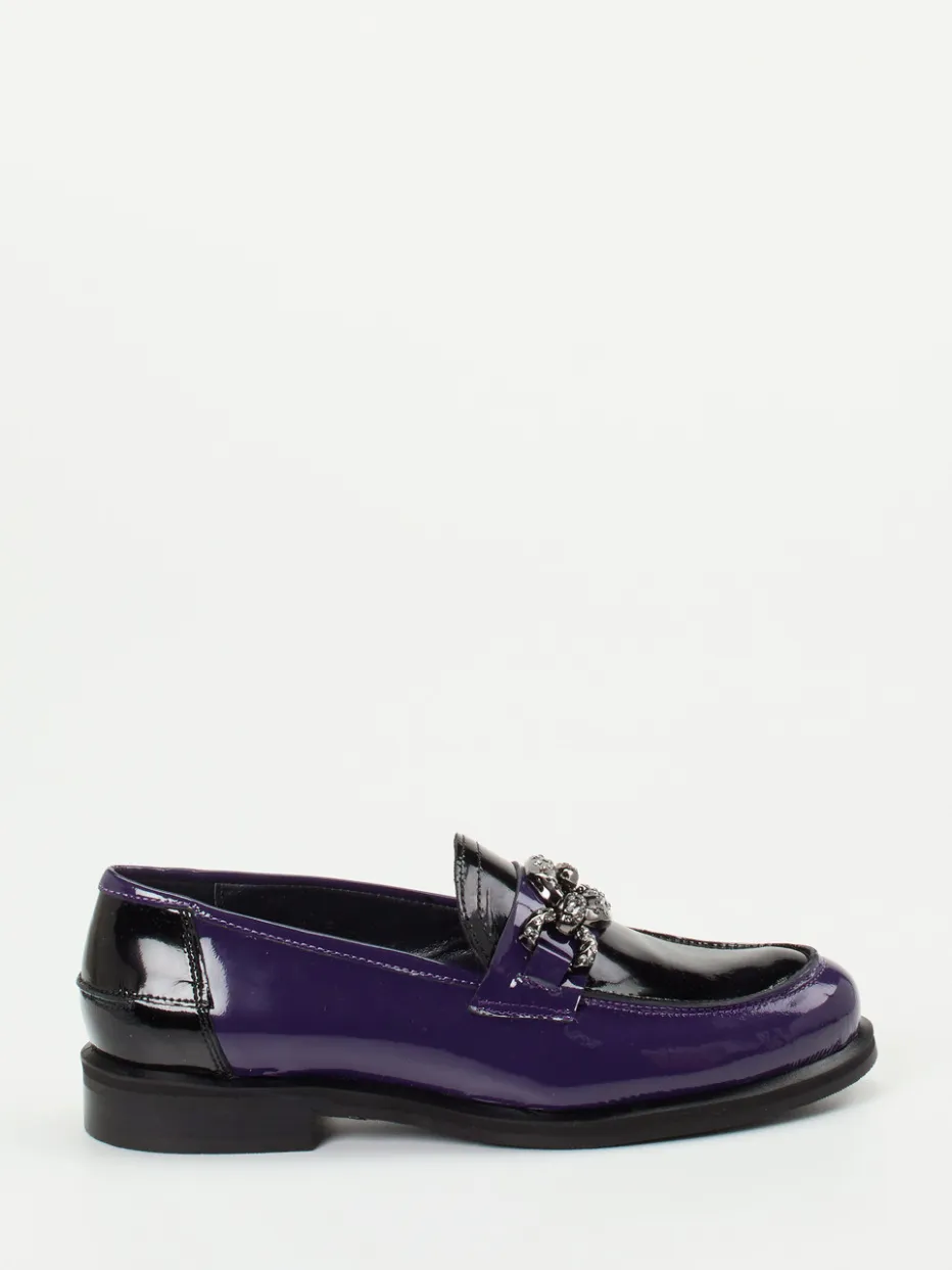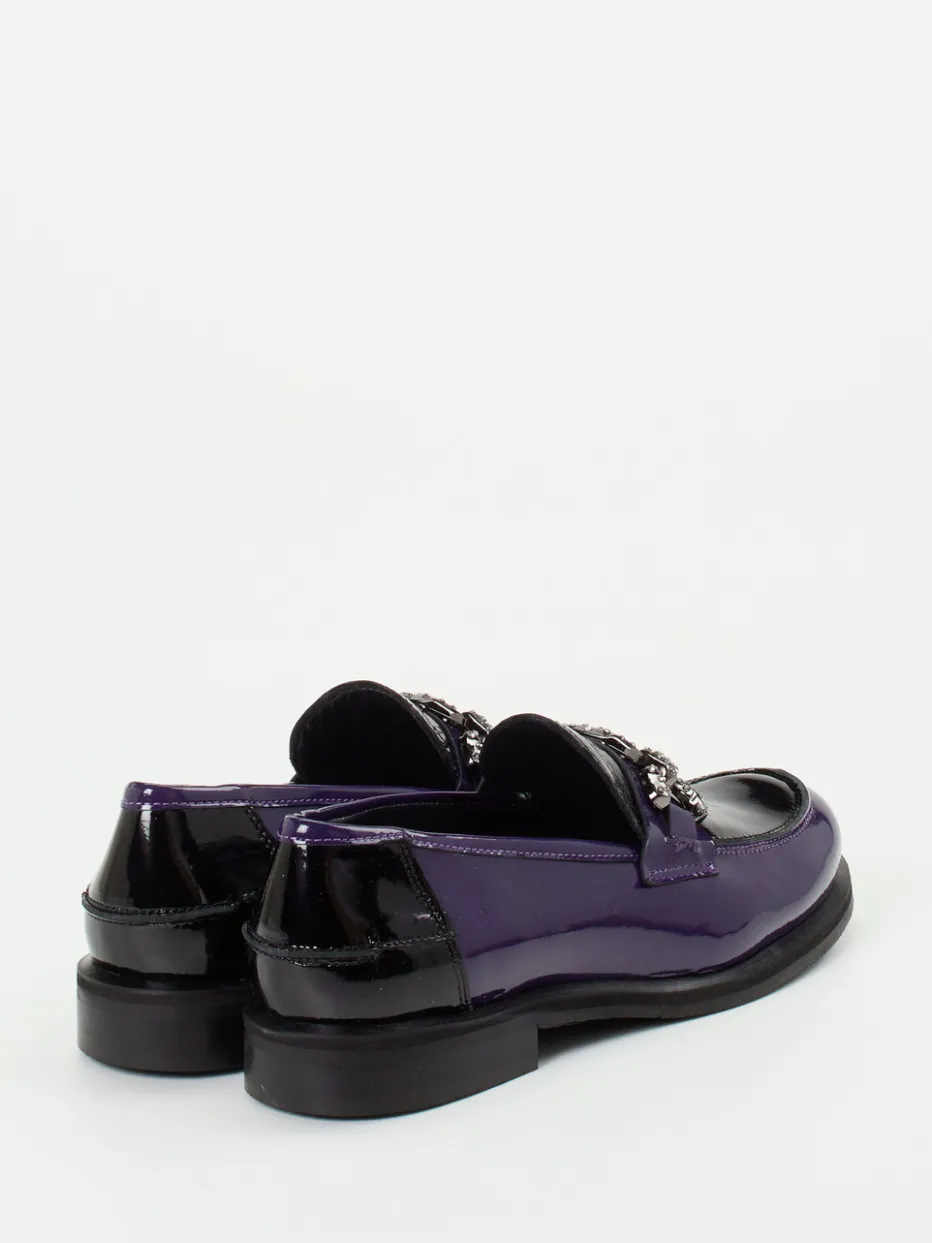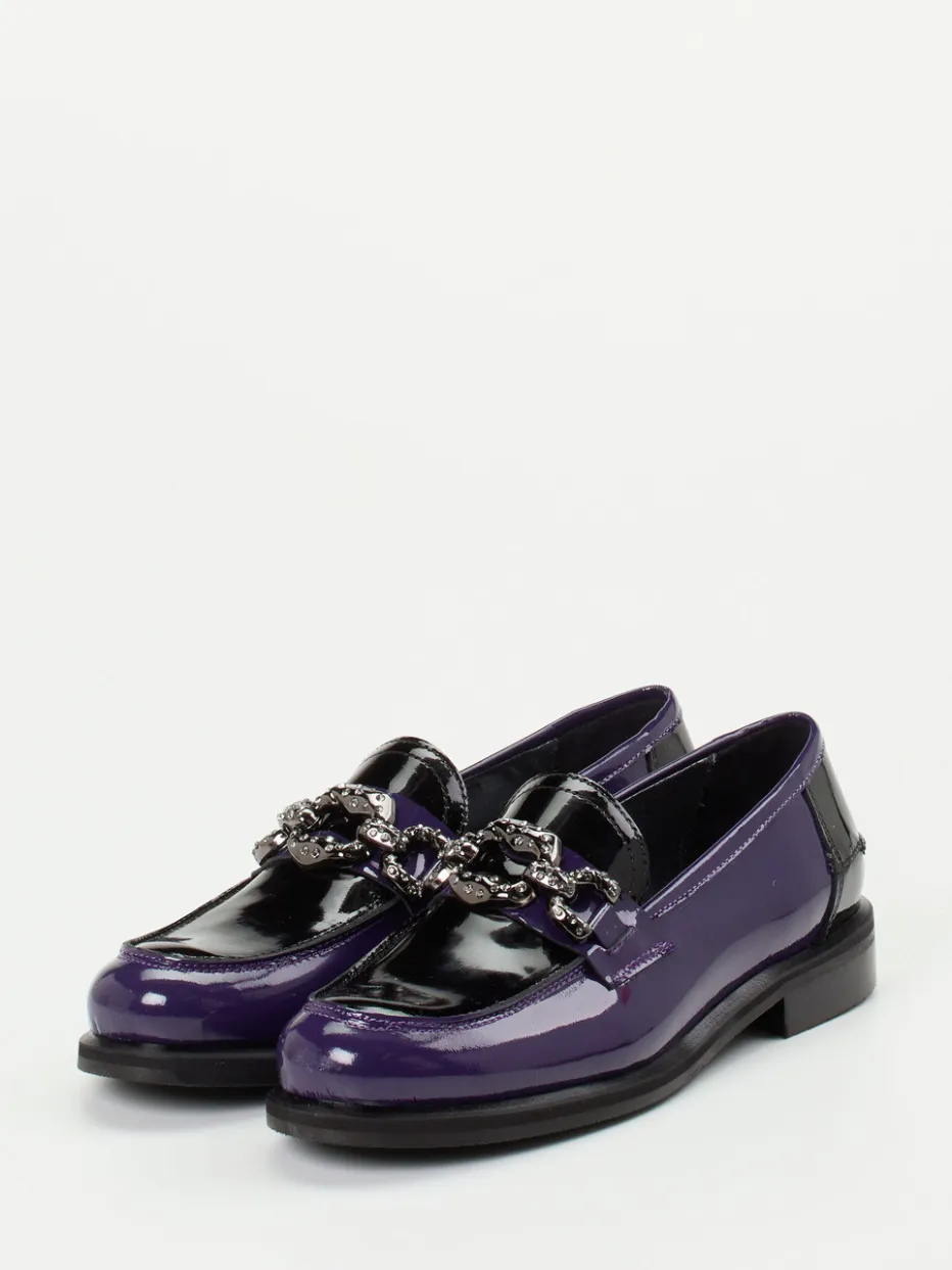 Ideal für den Übergang vom Büro ins Abendprogramm: Der in Violett und Schwarz gehaltene Damenschuh aus glänzendem Lackleder begeistert mit flacher Silhouette und einer auffälligen, silberfarbenen Gliederkette inklusive funkelnder Schmucksteine. Kalblederfutter und weich gepolstertes Fußbett sorgen innen für Komfort, während die profilierte Gummisohle rutschhemmende Eigenschaften bietet. Stilistisch knüpft das Modell an das Y2K-Revival an und lässt sich mit farblich abgestimmter Crossbody-Bag oder Blazer kombinieren.