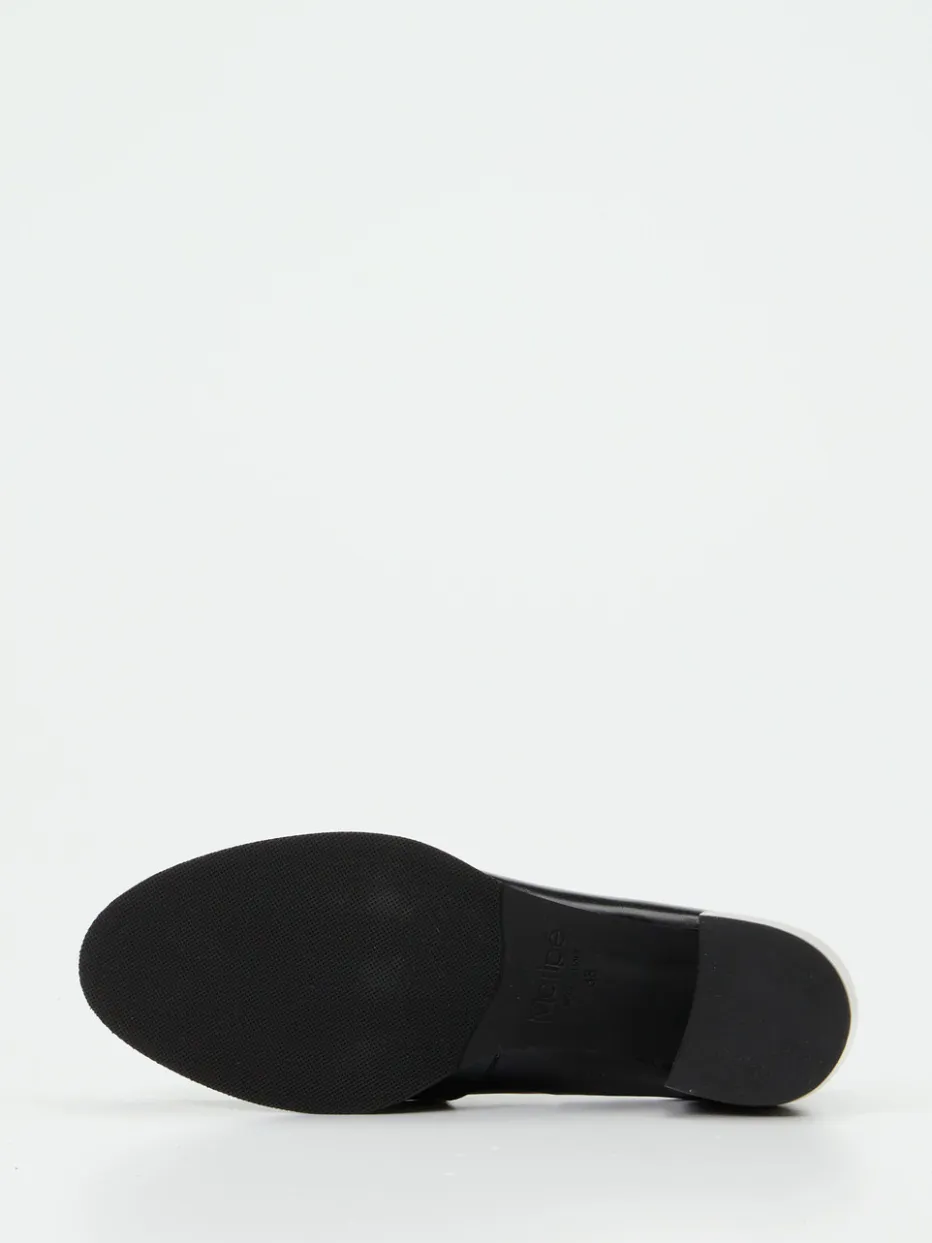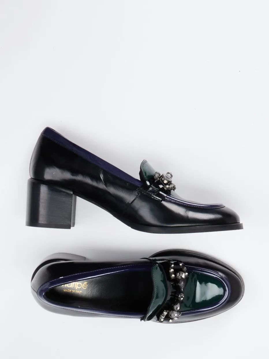 Dieser aufwendig gestaltete Damen-Loafer spielt gekonnt mit Materialkontrasten und Farben – ein stilvolles Statement zwischen Minimalismus und Vintage-Flair.