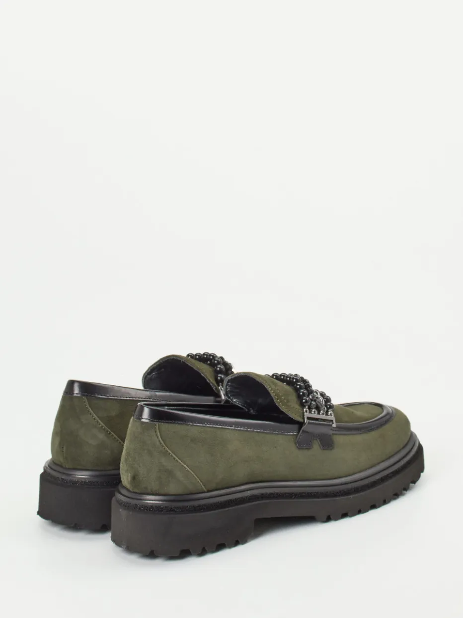 Statement in Olivgrün.Maripé interpretiert den klassischen Damen-Loafer mit einem modernen Look. Für einen stilvollen Übergang vom Büro in die City bietet dieser Loafer aus samtig angeschliffenem Veloursleder in tiefem Olivgrün das perfekte Stilmittel. Die glänzende, schwarze Gliederkette mit Perlen setzt ein markantes Statement, während die profilierte Leichtzellsohle mit 3 cm Absatz urbanen Komfort garantiert. Der Schlupfschuh kombiniert Minimalismus mit herbstlicher Streetwear-Ästhetik. Innen sorgt Kalblederfutter mit silberner Metallic-Note für gehobenen Tragekomfort. Trendstück mit eigenständiger Eleganz – typisch Maripé.