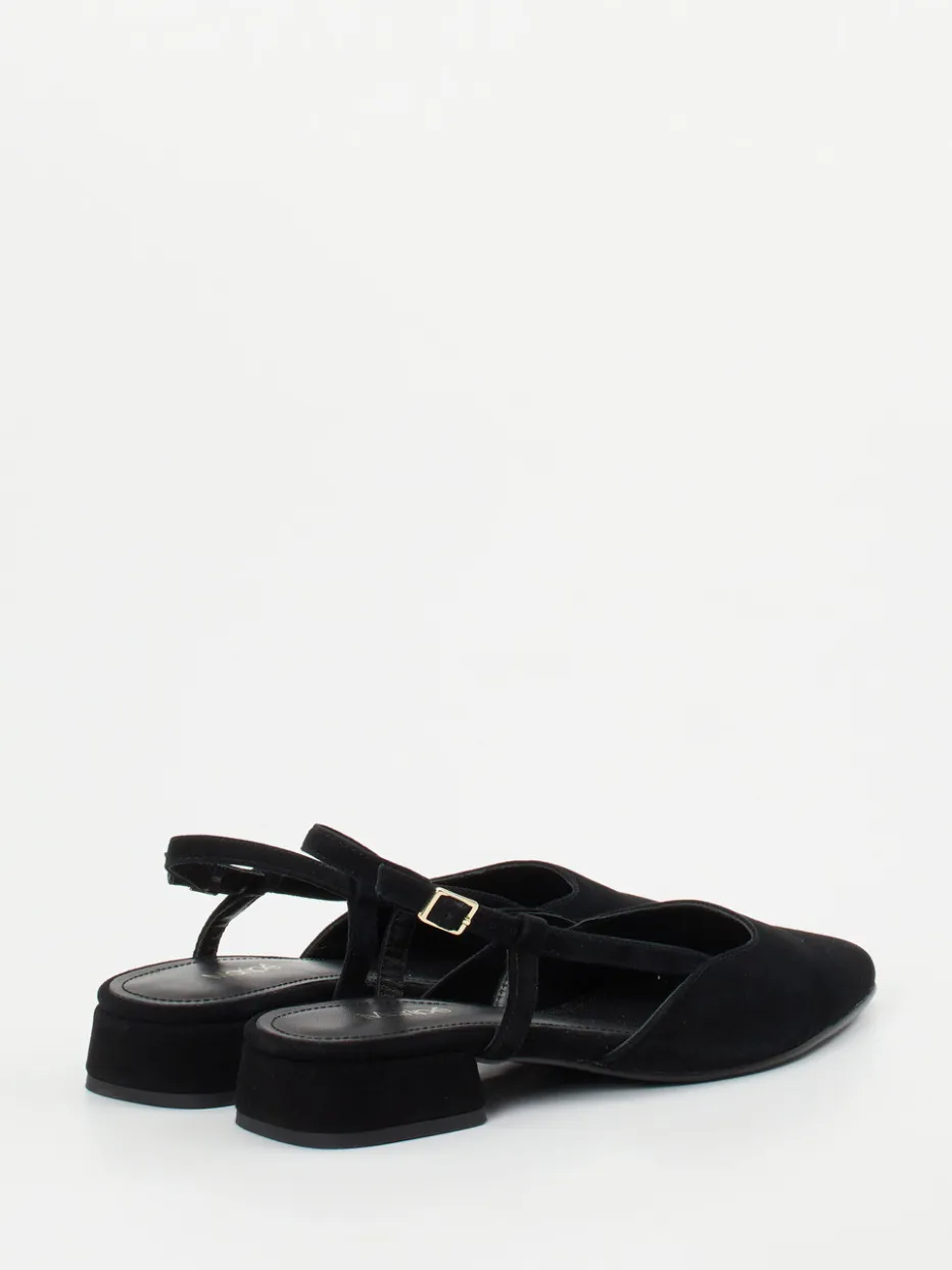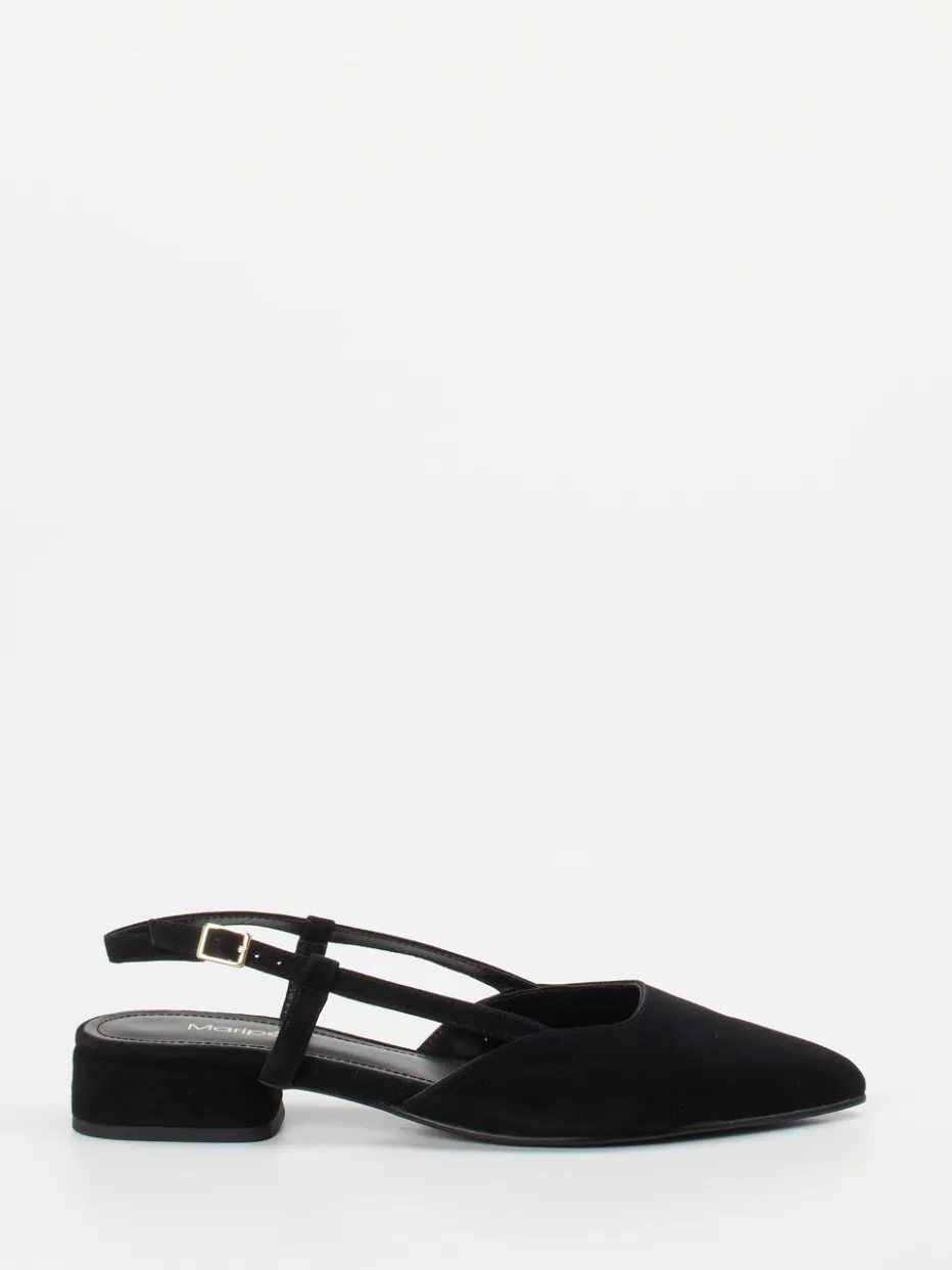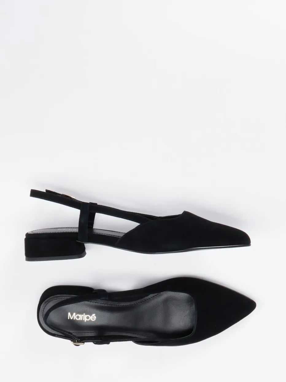 Understatement trifft Stilgefühl.Maripé präsentiert mit diesen Slingback-Ballerinas eine feminine Variation klassischer Damenschuhe. Ideal für den Büroalltag oder entspannte City-Walks verbinden sie alltagstauglichen Komfort mit zeitgemäßem Design. Das schwarze Veloursleder zeigt sich matt und samtig, ergänzt durch einen schlanken, spitz zulaufenden Leisten. Goldfarbene Schnalle, schmaler Fesselriemen und ein eleganter Blockabsatz unterstreichen die moderne Linienführung im „Quiet Luxury“-Stil. Der Slingback-Trend dieser Saison wirkt hier besonders edel und vielseitig kombinierbar – etwa zu monochromen Stoffhosen oder Culottes. Ein stilvoller Begleiter mit eleganter Signatur von Maripé.