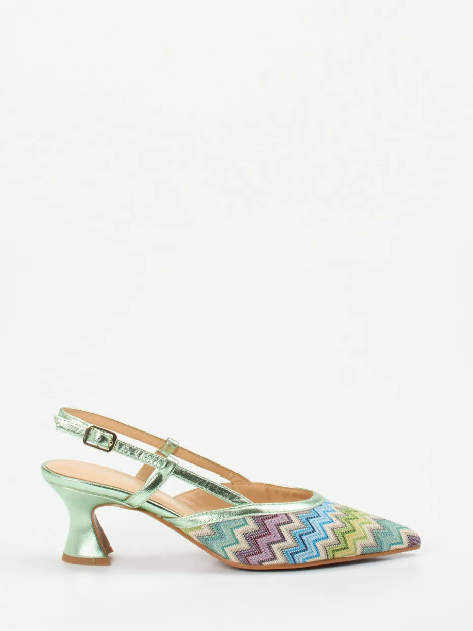 Ein Eyecatcher für warme Nächte.Maripé präsentiert mit diesen Slingback-Pumps ein feminines Modell für festliche oder modisch ambitionierte Anlässe. Das mehrfarbige Textil in Mintgrün mit Zickzackstruktur trifft auf metallic-schimmernde Riemen und eine spitz zulaufende Front. Der verstellbare Fersenriemen mit goldfarbener Schließe sorgt für optimalen Halt, während der trichterförmige Absatz in Skulpturform und das weiche Lederfußbett Komfort und Stil vereinen. Ein Must-have für trendbewusste Looks zwischen Italo-Glam und 70er-Revival, perfekt kombiniert mit pastelligen Kleidern oder Metallic-Accessoires. Ein charakterstarkes Modell mit außergewöhnlicher Farbharmonie und hochwertigen Materialien.