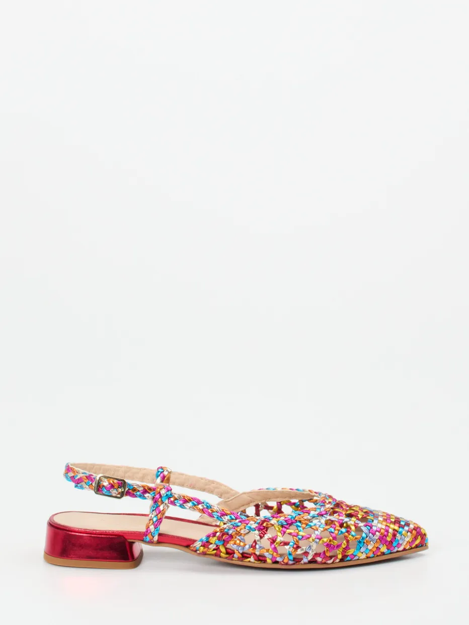 Ein Eyecatcher für sonnige Tage.Maripé bringt mit diesen Damen-Slingbacks farbenfrohe Spannung in jede Sommergarderobe. Für Urlaubstage oder sommerliche Citytouren bietet diese offene Schuhform mit verstellbarem Fersenriemen optimalen Komfort. Das fein geflochtene Metallicleder kombiniert Sonnengelb, Himmelblau und Metallic-Rot zu einem lebendigen Gesamtbild. Die glänzende Oberfläche passt perfekt zur spitz zulaufenden Silhouette und einem rot schimmernden Blockabsatz. Mit mediterranem Boho-Flair und Y2K-Akzenten ist das Modell stilistisch vielfältig anschlussfähig. Maripé verbindet modisches Statement mit italienischer Leichtigkeit und handwerklicher Raffinesse.