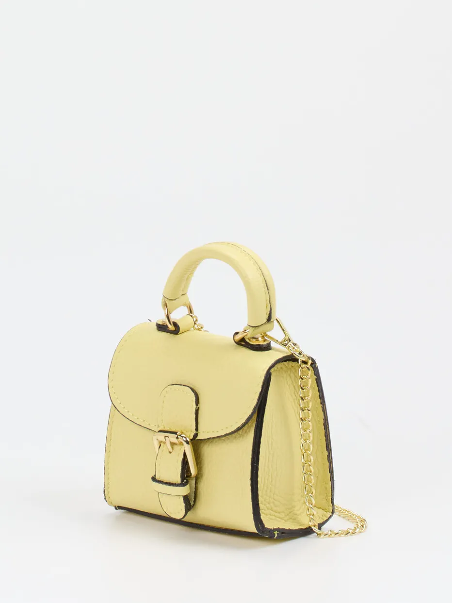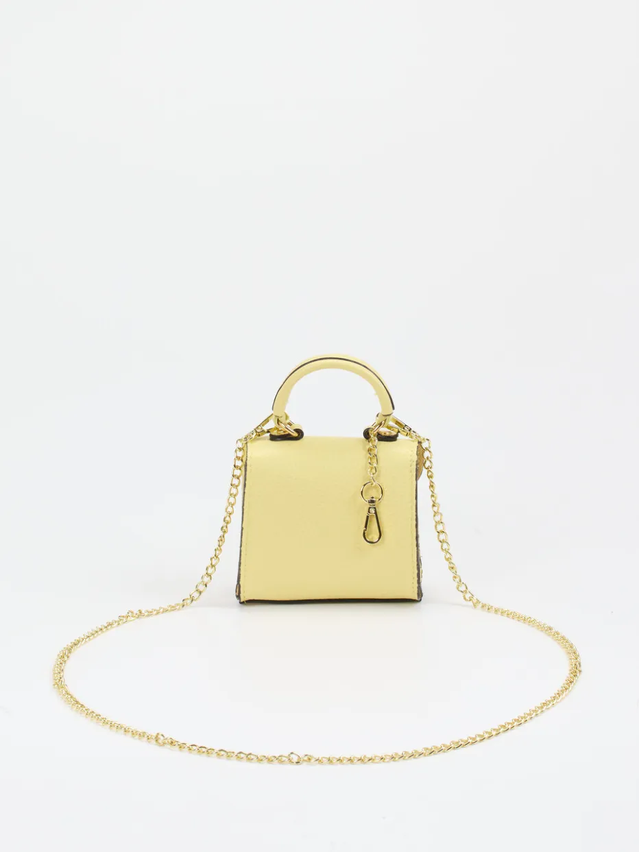 Diese Mini-Handtasche vereint edles Kalbleder in Pastellgelb mit Vintage-inspirierter Silhouette. Die goldfarbene Schulterkette setzt ein stilvolles Statement.