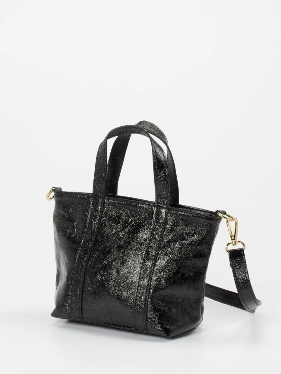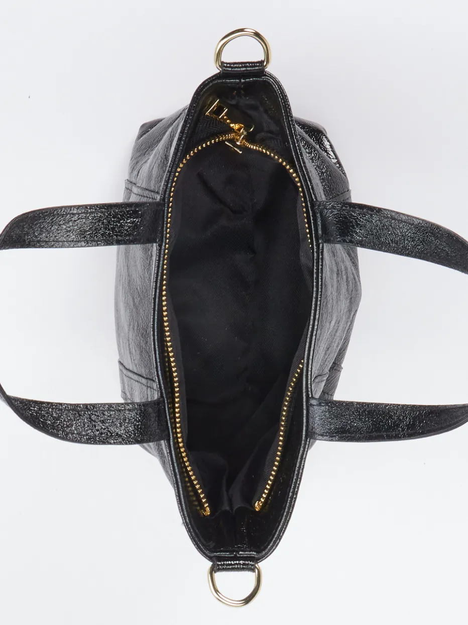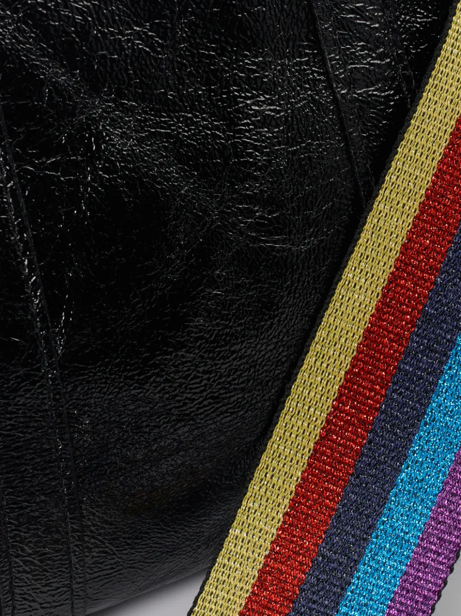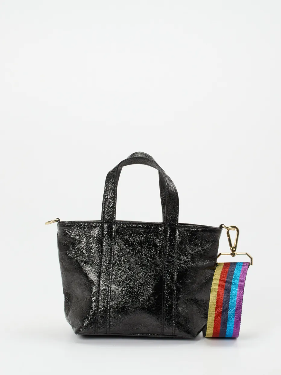 Diese Mini-Tote kombiniert das glänzende Finish von Metallicleder mit einem auffälligen Regenbogengurt – ein stilvoller Akzent für urbane Looks.