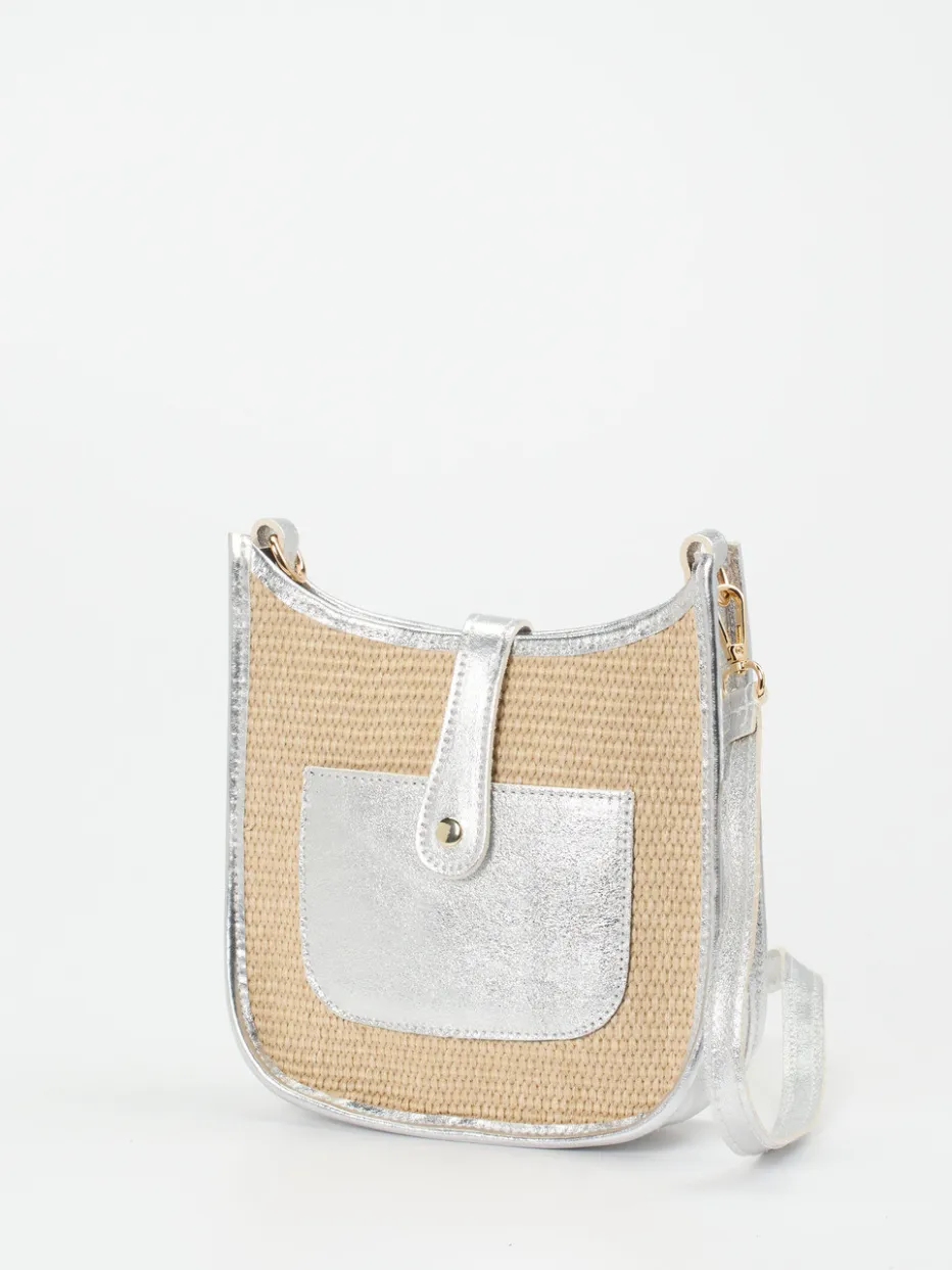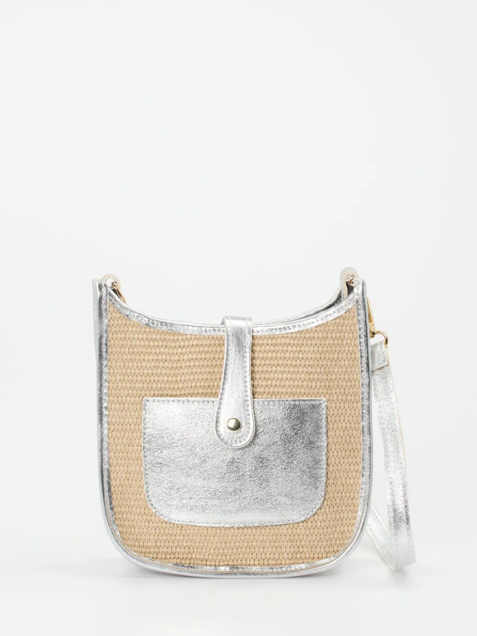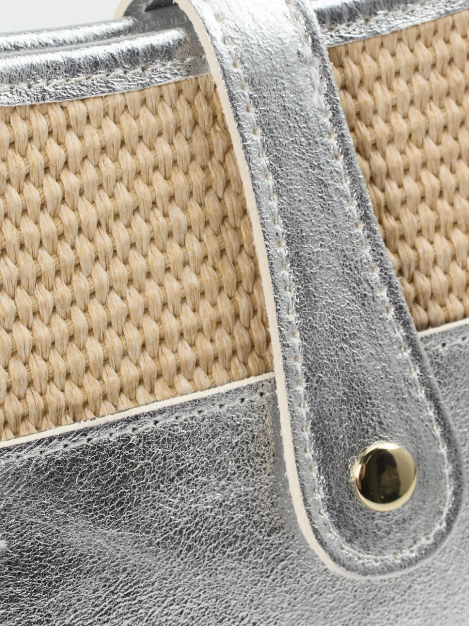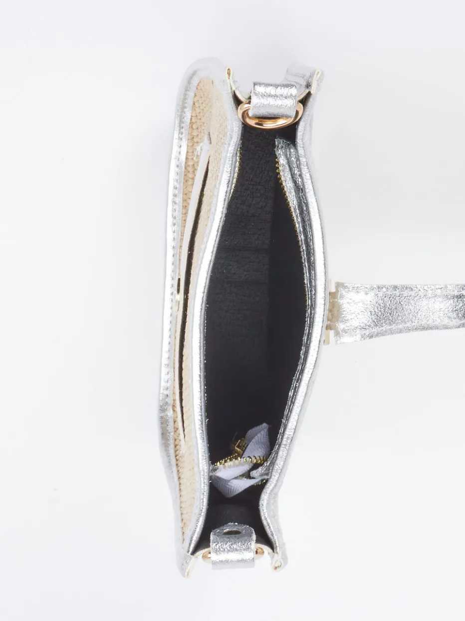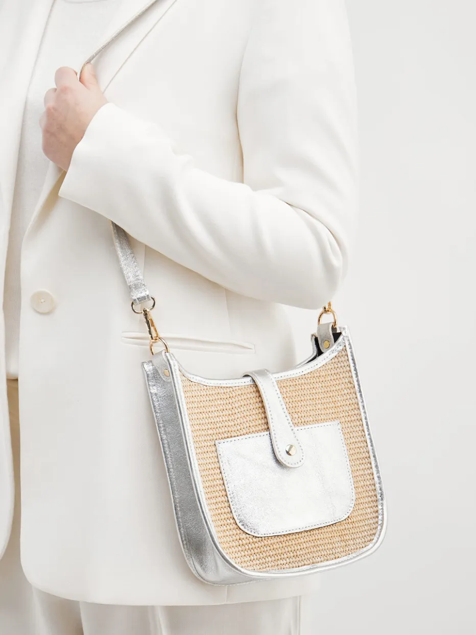 Die elegante Crossbody Bag von Marlon Firenze kombiniert geflochtenes Textil mit silberfarbenem Metallicleder – ein sommerlicher Stilbruch mit Trendpotenzial.