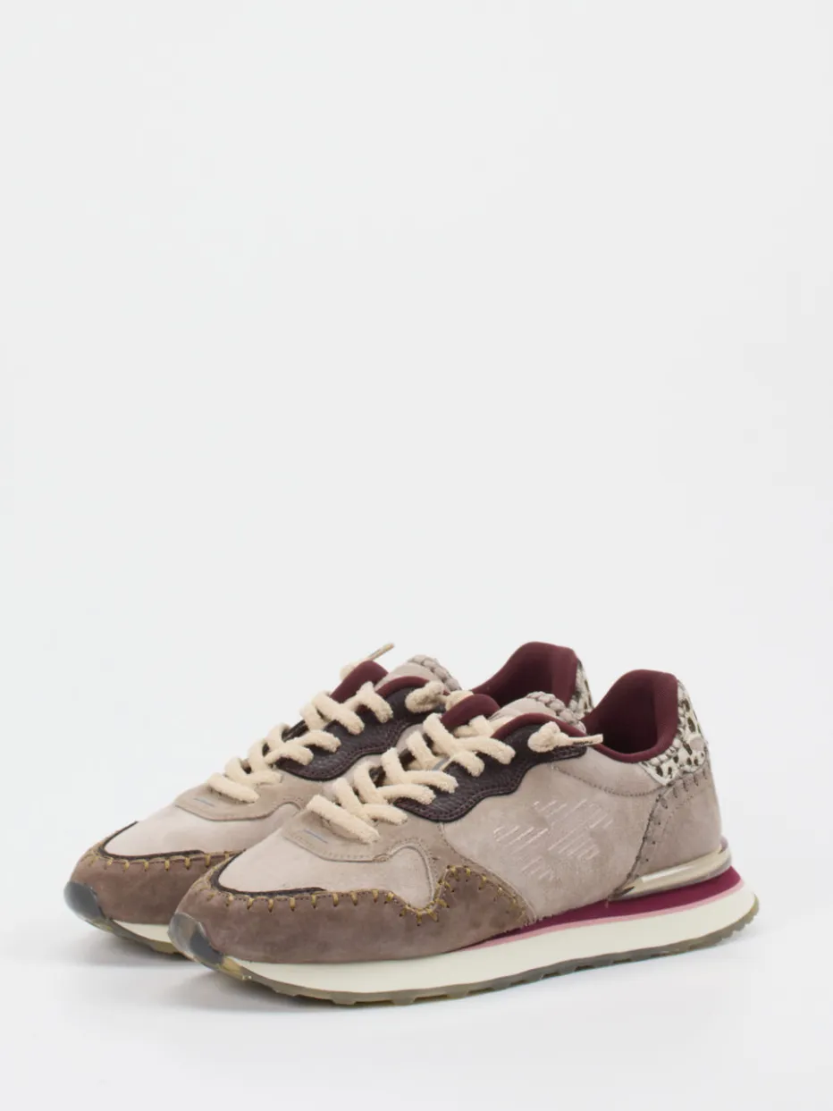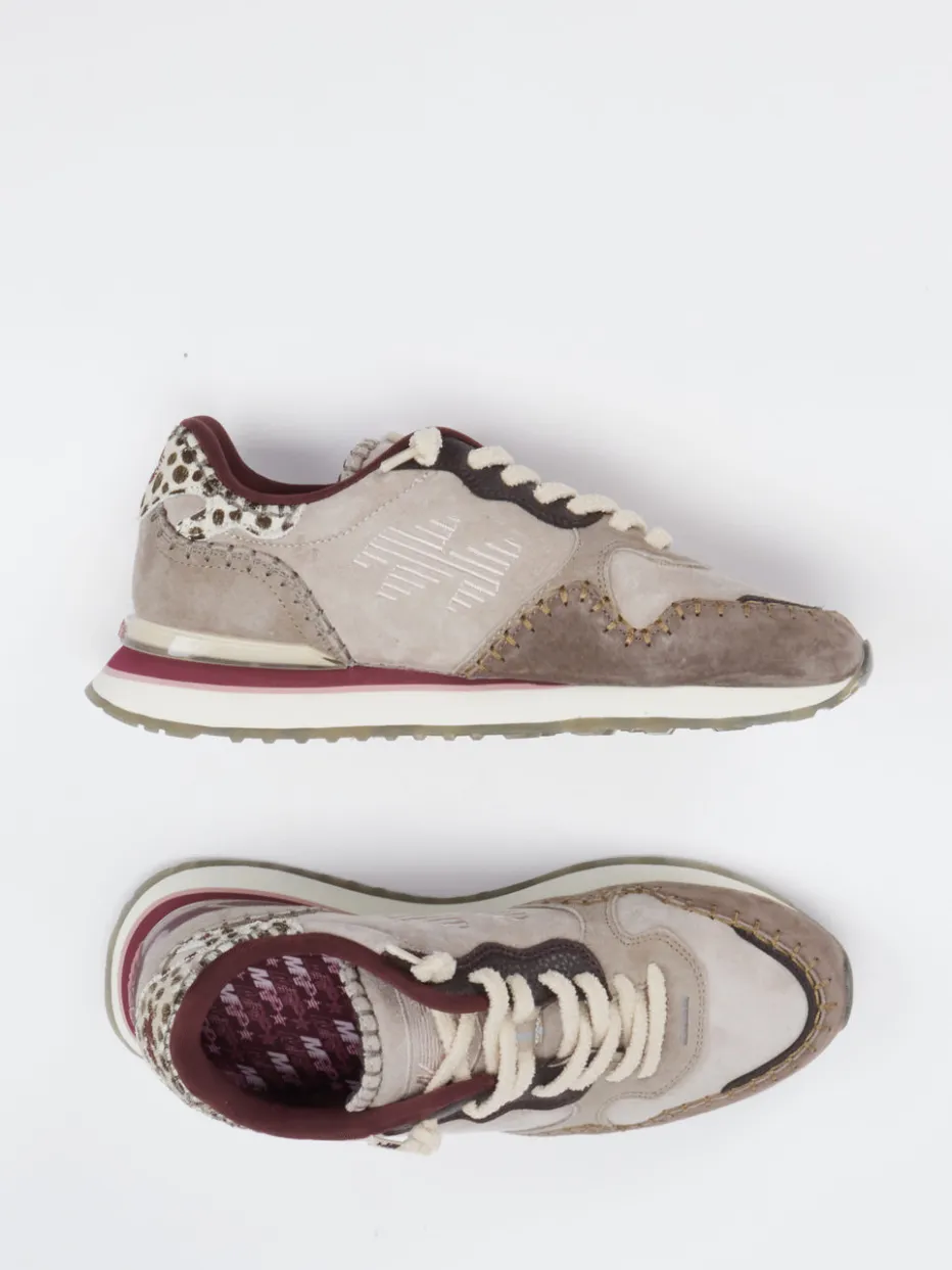 Vintage-Vibes mit modernem Twist.MRP präsentiert diesen Retro-Sneaker für Damen im ikonischen 90s-Stil. Ideal für entspannte City-Walks oder stylishe Reisen vereint er Komfort mit Eyecatcher-Qualität. Veloursleder – samtig angeschliffen – trifft auf feines Textil, während der beigegraue Grundton durch mittelbraune und bordeauxfarbene Akzente ergänzt wird. Ein Animal-Print an der Ferse, Kontrastnähte und ein gepolsterter Einstieg betonen das Design. Die profilierte Gummisohle setzt mit Leo-Print einen modischen Akzent und passt perfekt zum Trend ‚Animal Prints AW24‘. Lässt sich hervorragend mit einer beigefarbenen Steppjacke oder Crossbody-Bag kombinieren. Ein markanter Casual-Sneaker mit trendbewusster Formsprache von MRP.