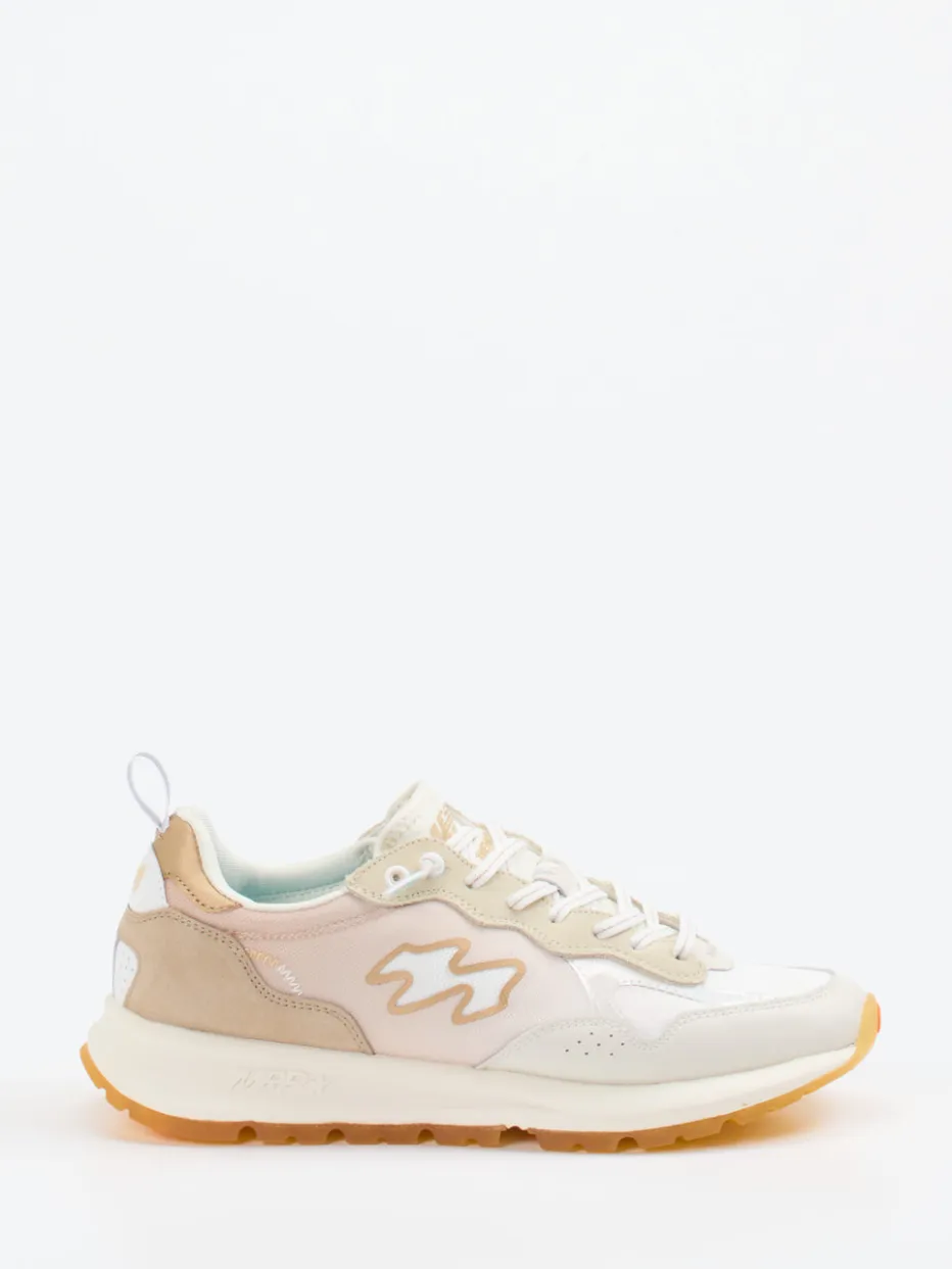 Ideal bei ausgedehnten Spaziergängen, verbindet das bequeme Modell eine leichte, stoßdämpfende Gummisohle mit einem Memory-Foam-Wechselfußbett. Der weiche Materialmix – samtig strukturiertes Veloursleder, Mesh und Glattlederimitat – zeigt sich in eleganten Beige- und Sandtönen mit weißem Farbverlauf. Reflektierende Elemente an der Ferse und eine rückseitige Zuglasche betonen den sportiven Streetwear-Look, der sich an aktuellen Retro-Tech-Trends orientiert. Perfekt kombinierbar mit Jogpants oder einer cremefarbenen Windjacke.