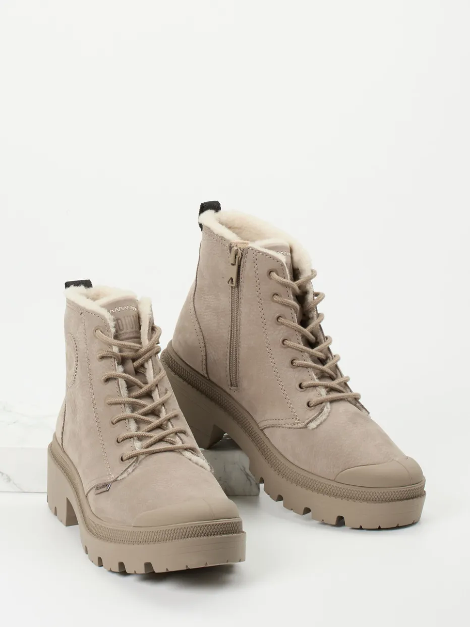 Stylisher Halt bei Winterwetter.Palladium präsentiert robuste Damen-Schnürboots für kalte Tage. Ob beim Stadtbummel oder auf winterlichen Spazierwegen – dieser knöchelhohe Schuh aus beigegrauem Nubukleder, samtig angeschliffen, überzeugt durch seine markante Utility-Silhouette. Ein warmes Innenfutter aus Kunstfell schützt zuverlässig vor Kälte, während die profilierte Gummisohle sicheren Grip bietet. Reißverschluss und Schnürung sorgen für komfortables An- und Ausziehen. Ton-in-Ton-Nähte und ein geprägtes Markenlogo runden den Streetwear-inspirierten Look ab. Harmoniert ideal mit Steppjacken oder Wollmänteln. Palladium vereint funktionales Design mit urbaner Alltagstauglichkeit.