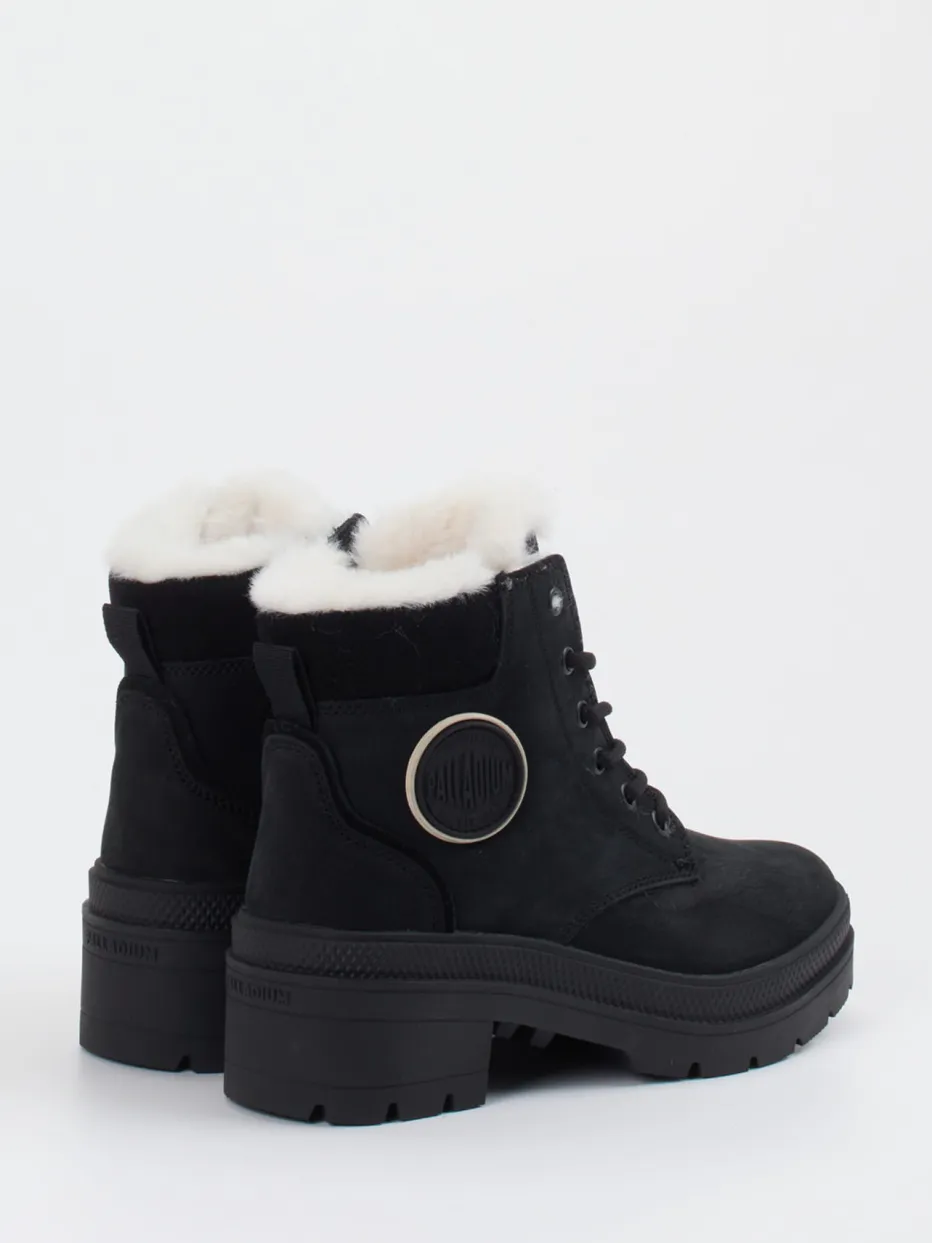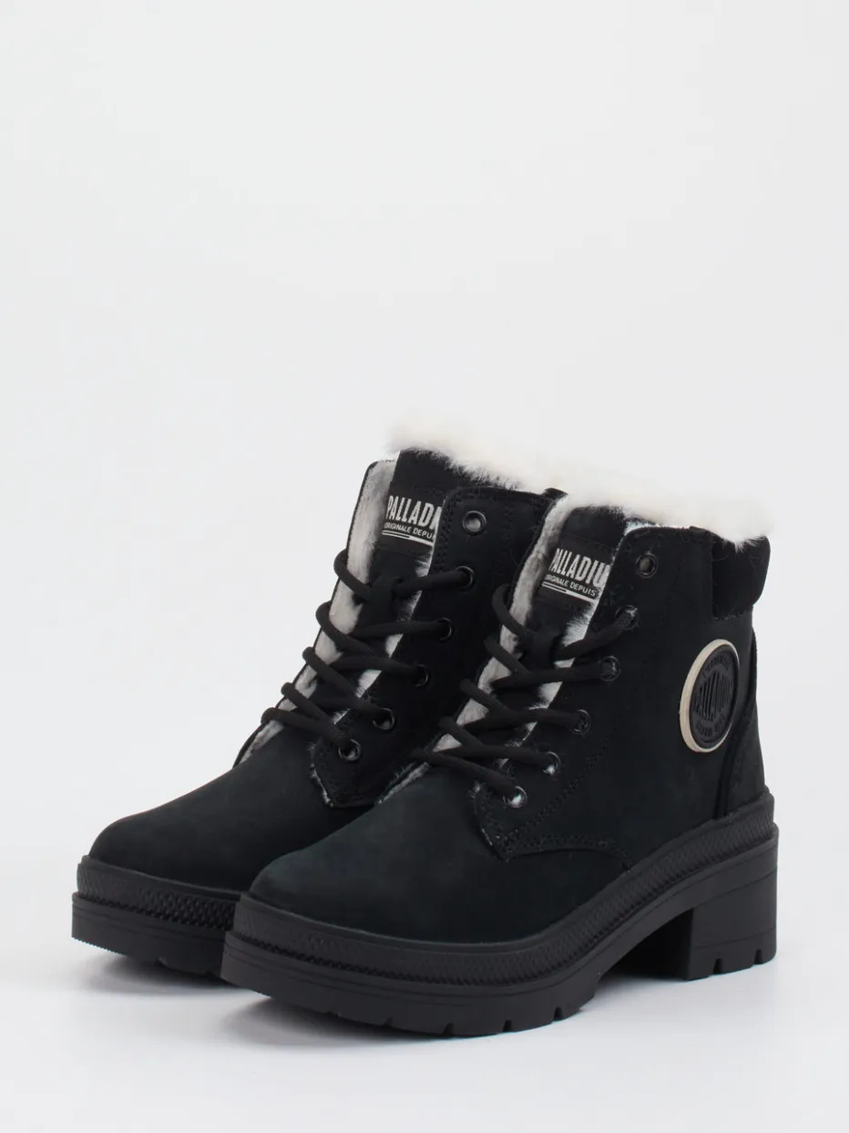 Gefüttert, griffig, alltagsstark.Palladium präsentiert mit dieser Damen-Stiefelette einen funktionalen Schnürboot für kalte Tage. Ob bei Spaziergängen durch verschneite Gassen oder im urbanen Alltag – das schwarze Veloursleder mit matter Oberfläche trifft auf sichtbares Kunstfellfutter und eine blockige Schnürsilhouette. Die Kombination aus Schnürung und Innenreißverschluss sorgt für optimalen Sitz, während die ausgeprägte Gummiprofilsohle Trittsicherheit garantiert. Ein seitlicher Logo-Patch rundet das Design ab. Stilistisch verortet zwischen Streetwear und Utility, passt der Boot besonders gut zu Thermo-Leggings und Oversize-Parkas. Ein wetterfester Begleiter mit markentypischer Robustheit und Komfort.