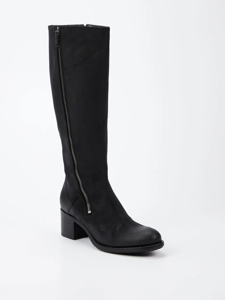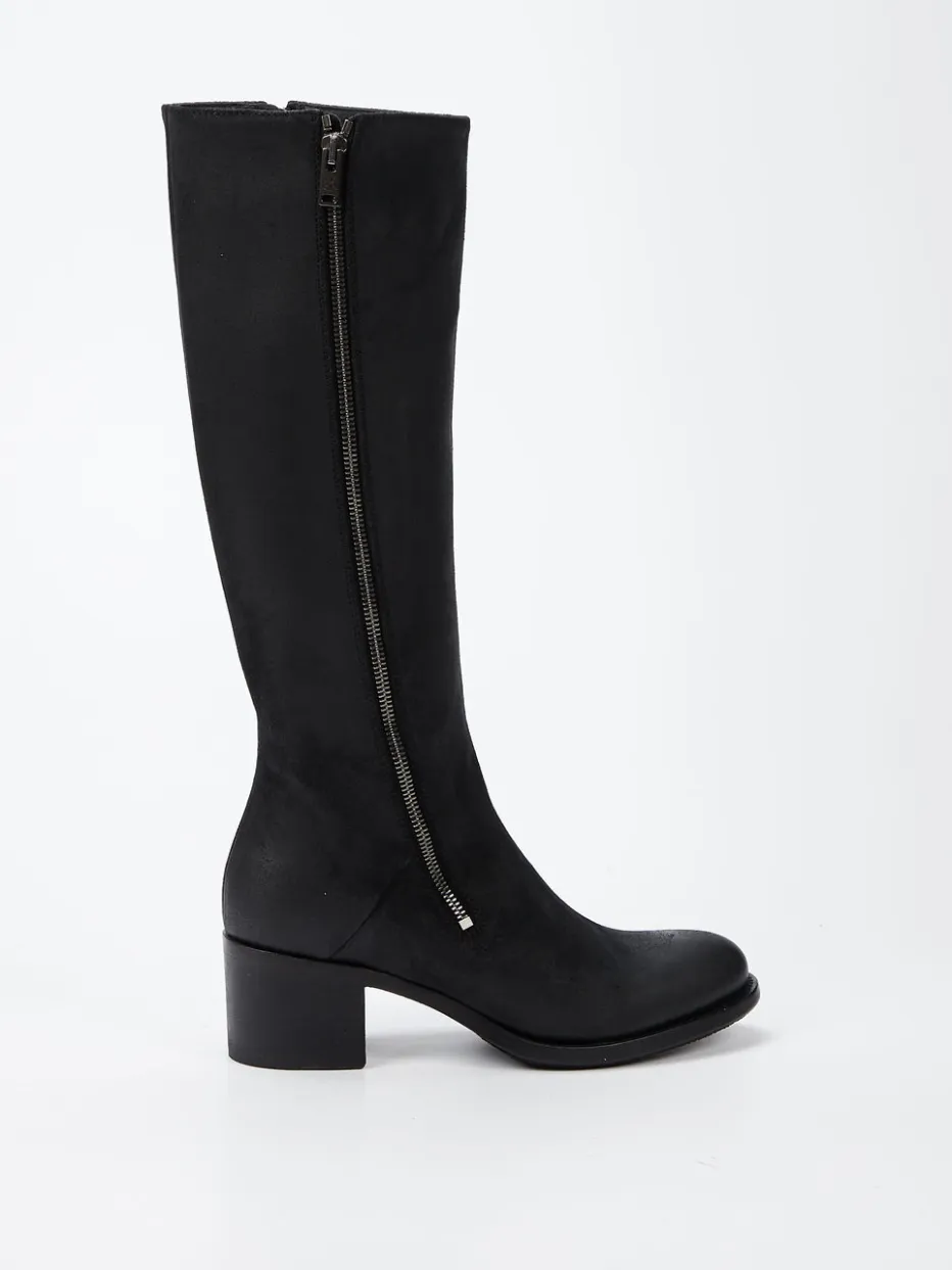 Schlichte Eleganz für urbane Looks.Pantanetti präsentiert mit diesen Kniestiefeln ein stilvolles Damenmodell für Herbst und Winter. Ideal für den Büroalltag oder elegante City-Outfits: Der Stiefel aus schwarzem, glatt gebürstetem Veloursleder zeigt sich mit matter Oberfläche und strukturierter Farbgebung. Der außenliegende Reißverschluss in dunkel nickelfarbenem Ton setzt mit dezent logo-geprägtem Schieber einen glänzenden Akzent. Innen sorgt ein zweiter Reißverschluss für komfortables Anziehen. Die rutschfeste Gummisohle und der 5 cm hohe Blockabsatz in Holzoptik bieten angenehme Laufhöhe bei urbaner Ästhetik. Modisch interpretiert der Stiefel trendige Quiet-Luxury-Silhouetten mit minimalistischer Raffinesse. Ein hochwertiges Statement für zeitlos reduzierte Stilrichtungen.