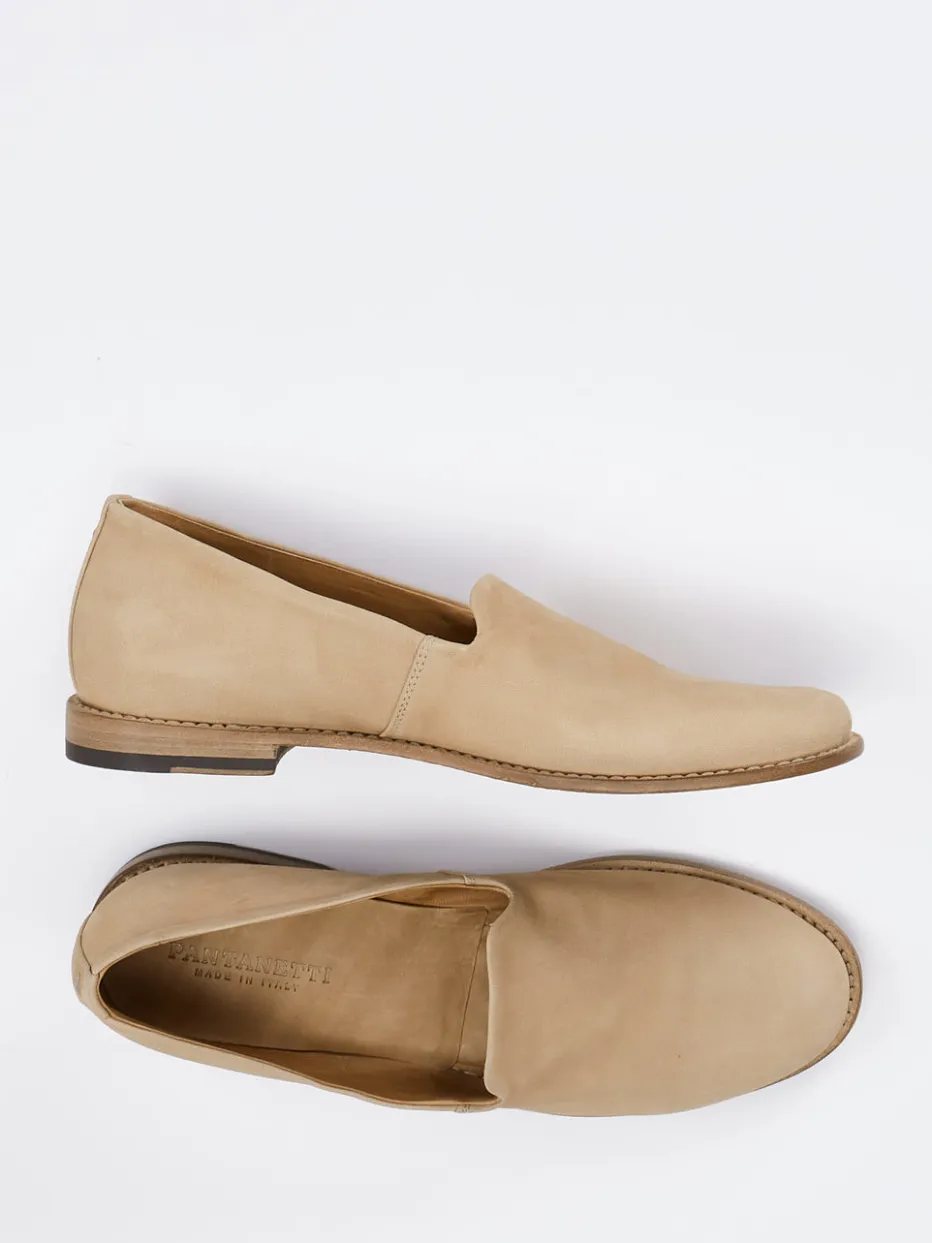 Handgefertigt in Italien und aus sandfarbenem Nubukleder gefertigt, vereint dieser Damen-Loafer minimalistisches Design mit höchstem Tragekomfort.