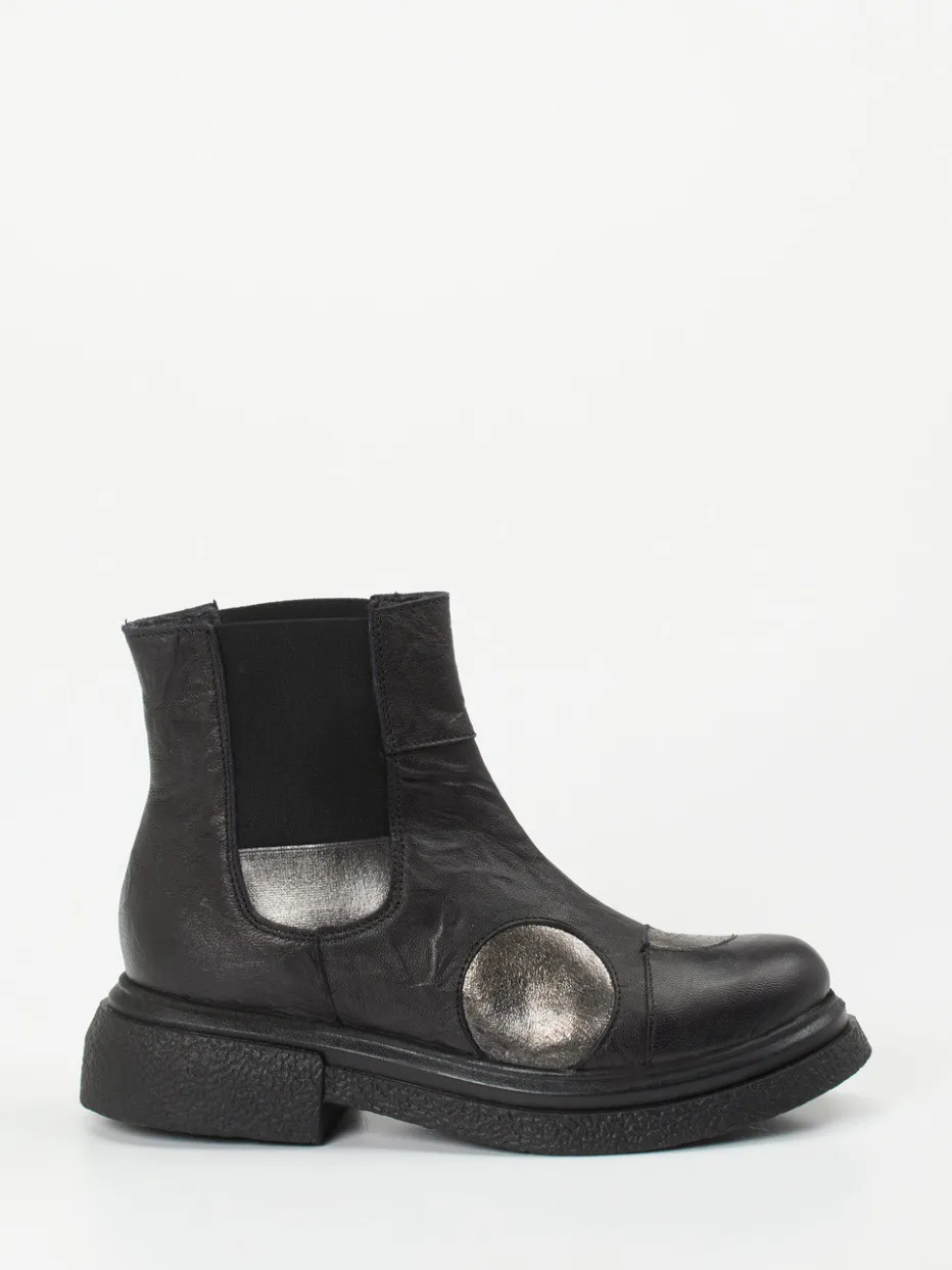 Statement-Stiefeletten mit Kontrasteffekt.Die Marke Papucei bringt mit diesen Chelsea Boots modisches Selbstbewusstsein in die Damenschuh-Kollektion. Ideal für urbane Stylings im Herbst oder bei abendlichen Anlässen: Das schwarze Leder wird durch runde, silberfarbene Metallic-Patches zum Blickfang, während die seitlichen Elastikeinsätze Komfort und Schlichtheit betonen. Die robuste Gummisohle mit strukturierter Oberfläche stützt den kräftigen Chunky-Look und sorgt für sicheren Tritt. Die knöchelhohe Silhouette ergänzt Streetwear ebenso wie minimalistische Layering-Outfits. Als Trendpiece greifen die Boots gezielt aktuelle Metallic-Akzente auf. Papucei zeigt hier ein kunstvolles Design für expressive Styles mit unverwechselbarem Charakter.