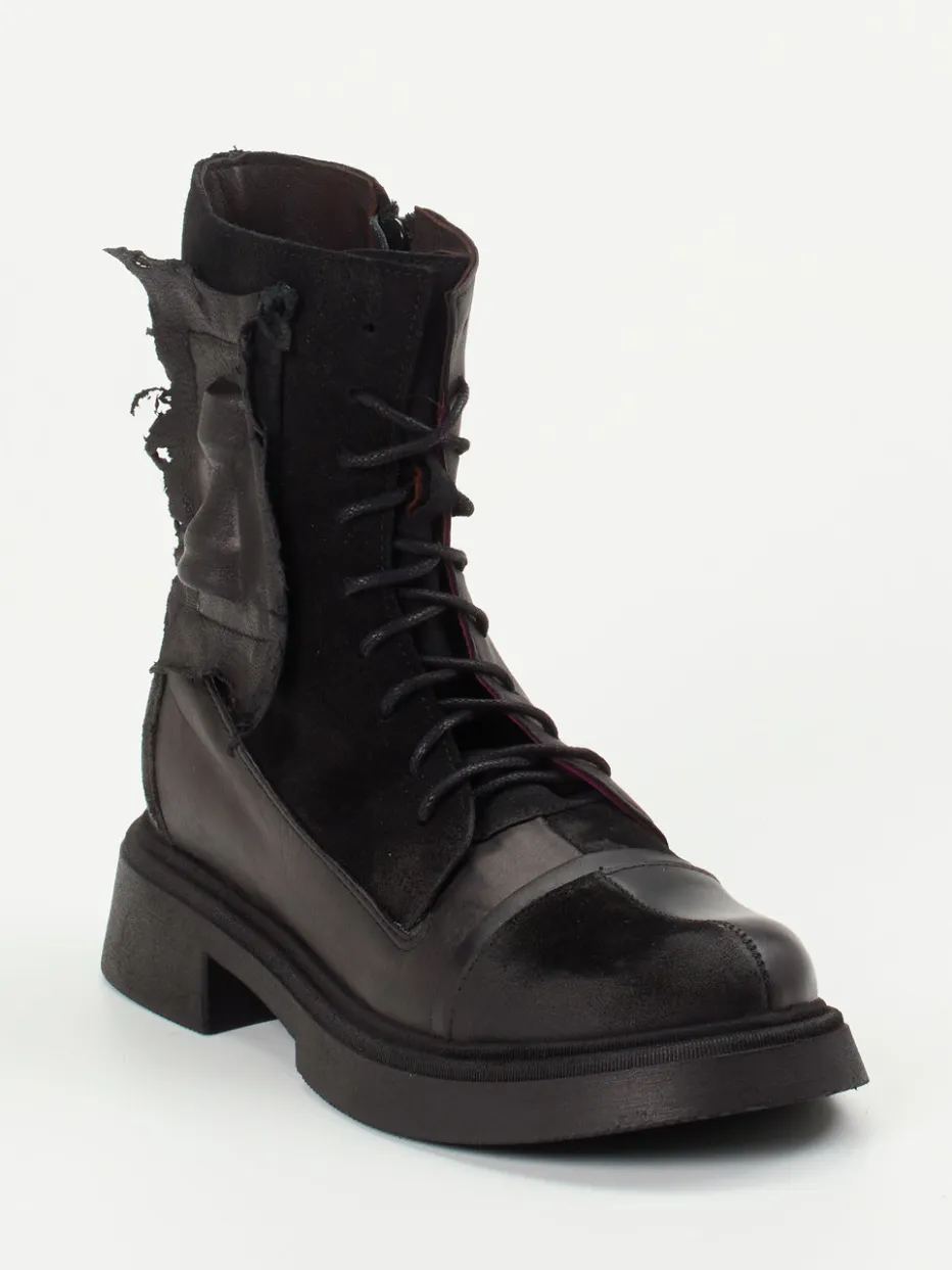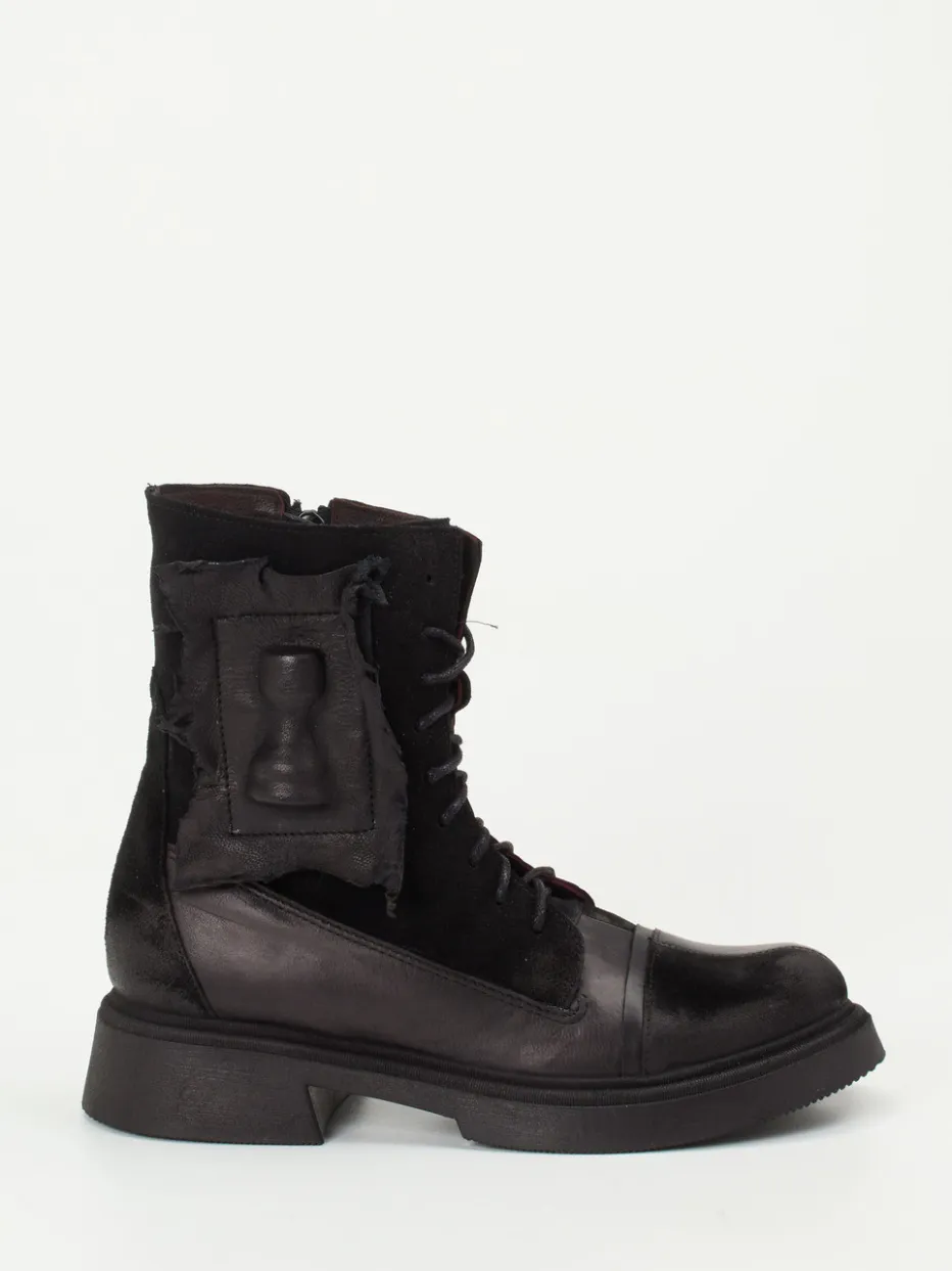 Stil mit Struktur und Ausstrahlung.Die Marke Papucei präsentiert mit dieser knöchelhohen Stiefelette ein kraftvolles Beispiel avantgardistischer Schnürboots. Konzipiert für urbane Looks mit Haltung, kombiniert das Modell tiefschwarzes Kalbleder mit samtig angeschliffenem Veloursleder. Die markante Lederapplikation mit ausgefranstem Rand und Prägung in Schachfigur-Optik zieht alle Blicke auf sich. Ton-in-Ton-Schnürung, seitlicher Reißverschluss und ein robustes Profil komplettieren den modischen Utility-Charme. Als stilistisches Statement lässt sich diese Silhouette mit Oversized-Coats oder minimalistischen Outfits kombinieren. Mit starkem Designfokus setzt Papucei ein klares Zeichen für charakterbetontes Schuhwerk.