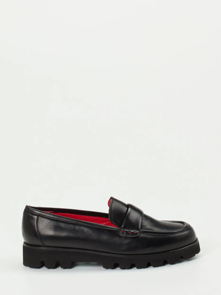 Dieser Damen-Loafer vereint hochwertiges Lammleder mit einem modernen Schwarz-Rot-Kontrast. Die markante Leichtzellsohle verleiht ihm stilvolle Präsenz und Komfort.