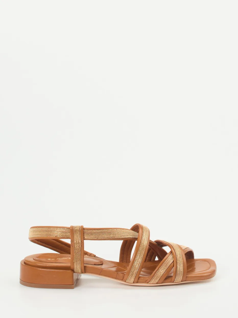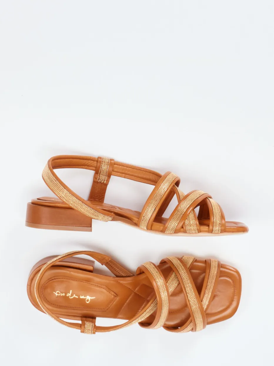 Glanzvoller Komfort für Sommertage.Pas de Rouge präsentiert mit dieser Riemchensandale eine stilvolle Ergänzung für anspruchsvolle Sommerlooks. Die elegante Sandale bietet durch butterweiches Lammleder in warmem Kupferbraun ein luxuriöses Tragegefühl. Goldfarbene, glänzend veredelte Textilriemen setzen dekorative Highlights, während ein elastischer Fersenriemen für bequemen Halt sorgt. Die offene Form und der lederbezogene Blockabsatz auf Carréleisten betonen den femininen Charakter und unterstützen modische City-Styles mit Vintage-Note. Perfekt abgestimmt auf luftige Leinenkleider oder fließende Jumpsuits. Der Mix aus italienischer Handwerkskunst und eleganter Zurückhaltung verleiht der Sandale ihren exklusiven Charakter.