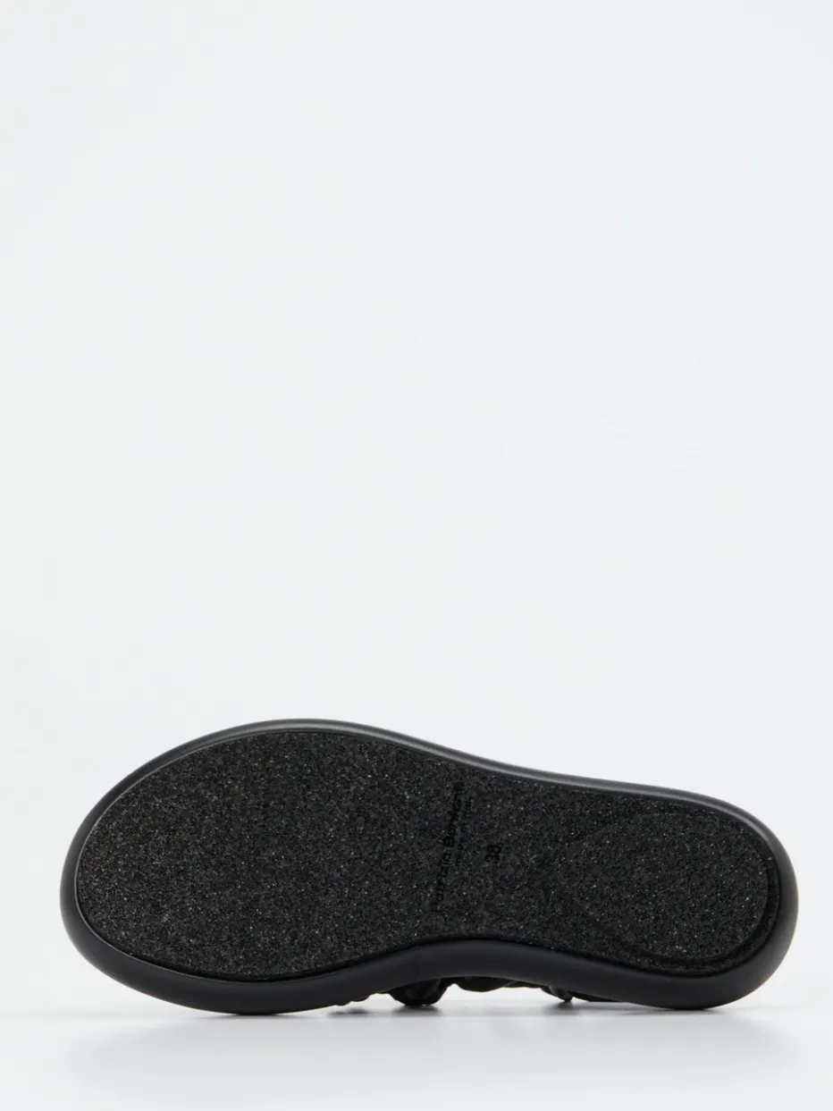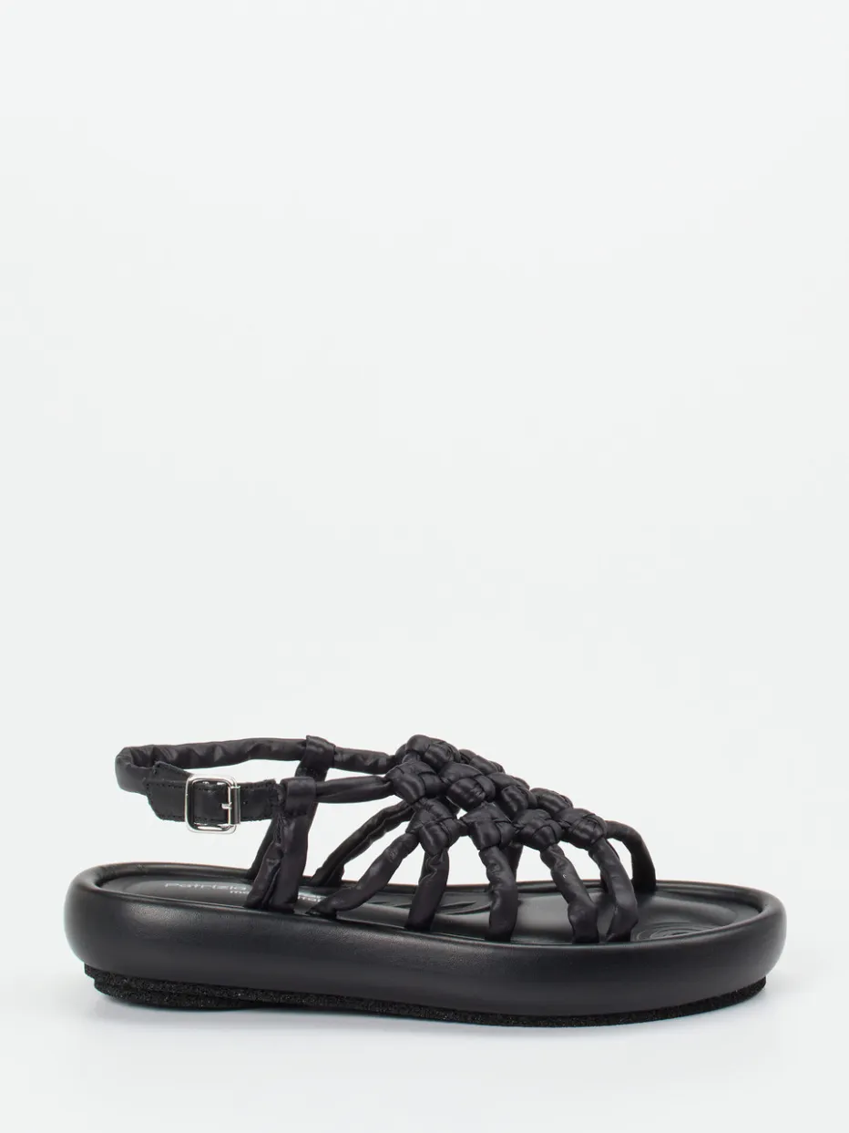 Trendbewusst und komfortbetont.Die Marke Patrizia Bonfanti präsentiert eine Keilsandalette mit elegantem Minimalismus. Ideal für Momente sommerlicher Leichtigkeit: Diese schwarze Sandale überzeugt mit einem weich gepolsterten Fußbett und einer offenen, runden Silhouette. Hochwertiges Lammleder trifft auf eine voluminöse, wattierte Flechtoptik, die modern interpretiert ist. Die individuell verstellbare, silberfarbene Schnalle ergänzt Funktionalität mit Stilbewusstsein. Der flache, strukturierte Gummisohlenaufbau sorgt für Grip und Laufkomfort. Inspiriert von Streetwear und Quiet Luxury unterstreicht das Modell lässige Freizeitlooks ebenso wie urbane Sommeroutfits. Innovatives Design mit handwerklicher Raffinesse – typisch Patrizia Bonfanti.