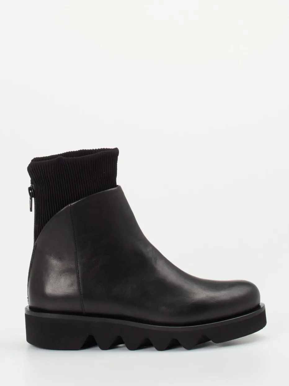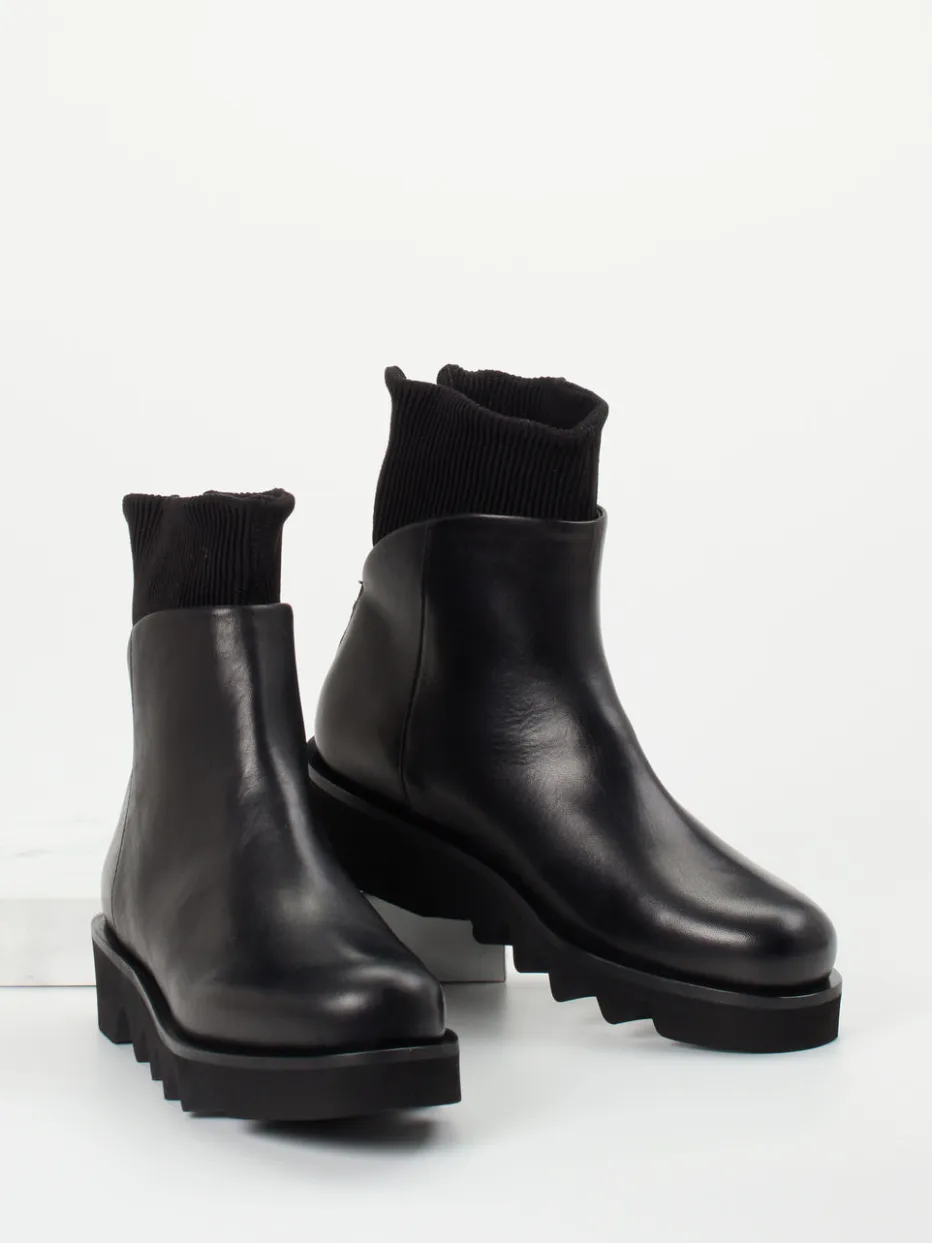 Die Stiefelette verbindet exklusives Kalbleder mit elastischem Strickschaft und markanter Chunky-Sohle – modisch wie funktional ein urbanes Statement.