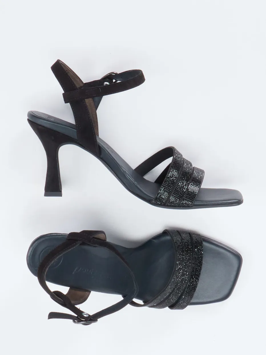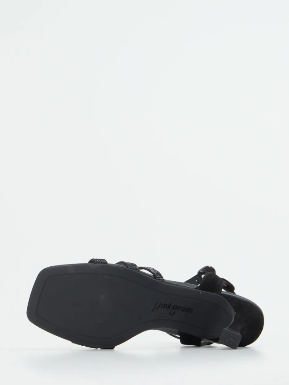 Eleganz mit funkelndem Akzent.Paul Green präsentiert mit dieser High Heel Sandalette ein Modell für ausgesuchte Abendanlässe. Die Kombination aus schwarzem Metallicleder und glitzernden Riemchen verleiht dem Modell eine glamouröse Ausstrahlung. Die offene, filigrane Silhouette mit verstellbarem Knöchelriemen sorgt für optimalen Halt. Ein 7 cm hoher Trichterabsatz betont die feminine Linie, während die hochwertige Gummisohle für Trittsicherheit sorgt. Die matte Oberfläche wirkt modern und stilbewusst – ein Highlight für festliche Events der Saison. Kombiniert mit einem dunklen Abendkleid entfaltet das Design seine volle Wirkung. Ein Modell mit Raffinesse und handwerklichem Anspruch aus dem Haus Paul Green.