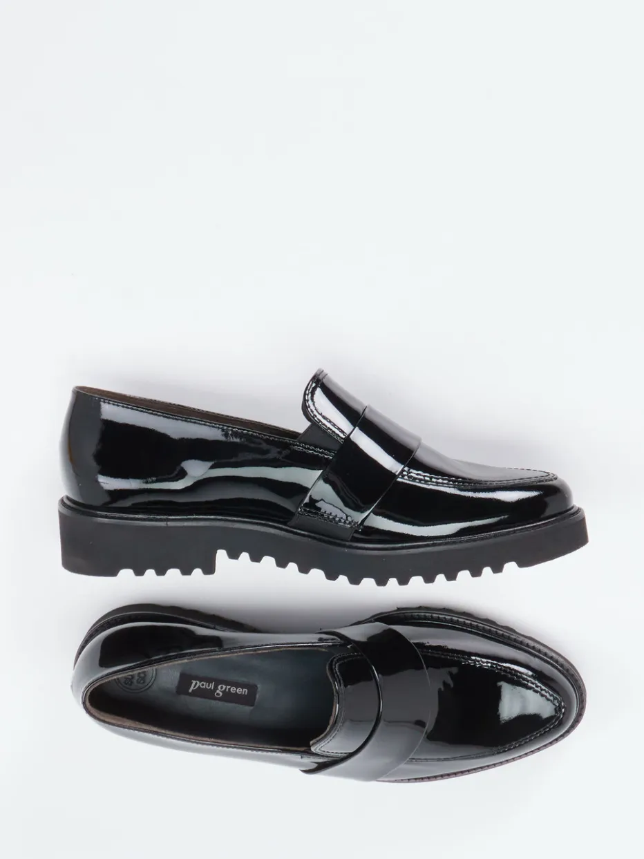 Schwarzer Klassiker mit Glanz-Finish.Paul Green präsentiert mit diesem Damen-Loafer eine ebenso zeitgemäße wie stilbewusste Slipper-Variante. Ob im Office oder beim City-Bummel – der schwarze Loafer verbindet glänzendes Lackleder mit klassischen Linien und moderner Profilsohle. Die glatte, flächige Oberfläche wird durch dezente Ton-in-Ton-Nähte betont, während elastische Einsätze für hohen Tragekomfort sorgen. Dank der rutschhemmenden Gummisohle mit 3 cm Absatz bietet das Modell sicheren Halt bei femininer Silhouette. Der Look verkörpert den aktuellen Chunky-Loafer-Trend mit Anklängen an „Quiet Luxury“. Kombiniert mit weiter Stoffhose entsteht ein souveräner Alltagsstil. Ein femininer City-Slipper mit komfortabler Eleganz à la Paul Green.