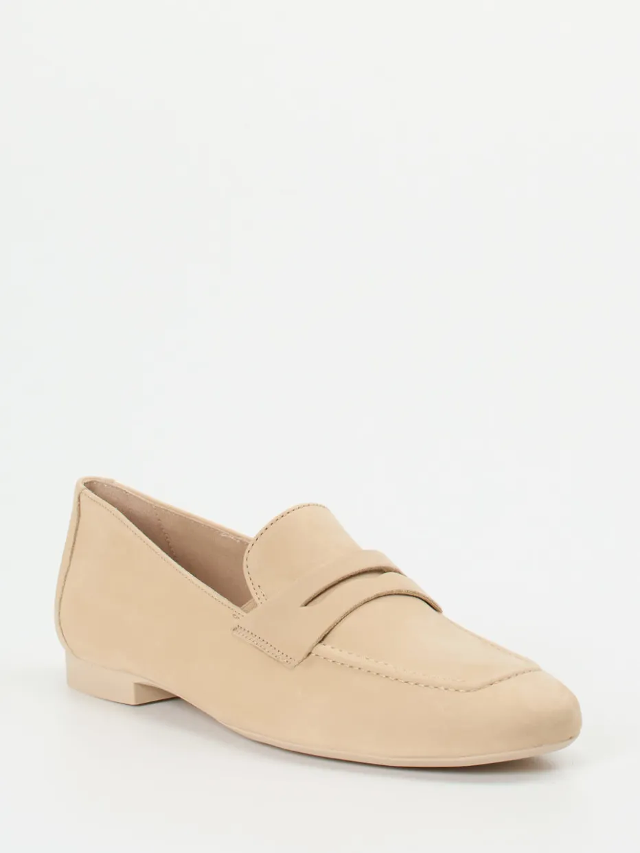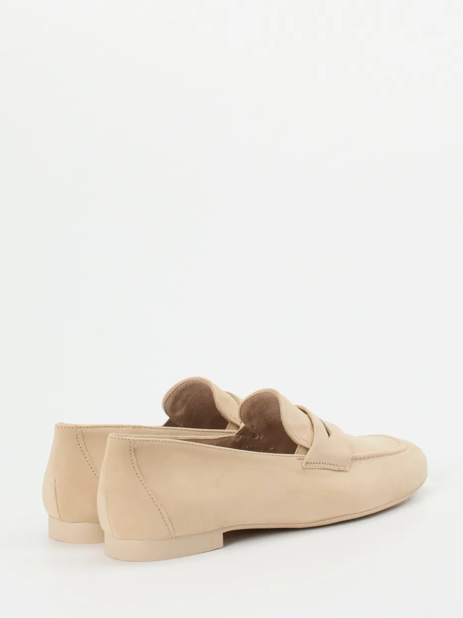 Klassisch-flacher Damen-Loafer in trendigem Beige überzeugt mit softem Veloursleder, tonaler Gummisohle und hochwertiger Innenverarbeitung – ideal für gepflegte Business- und Alltagslooks.