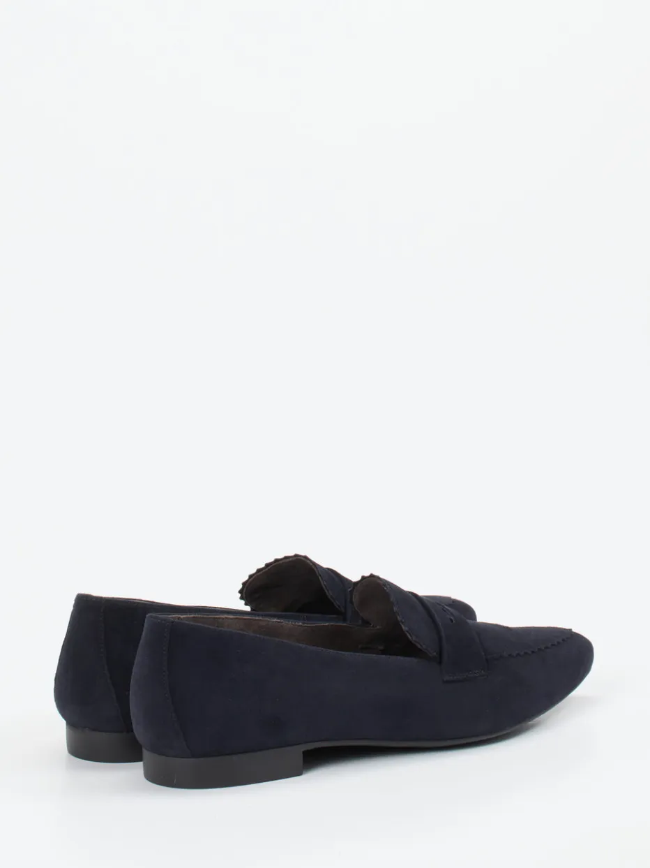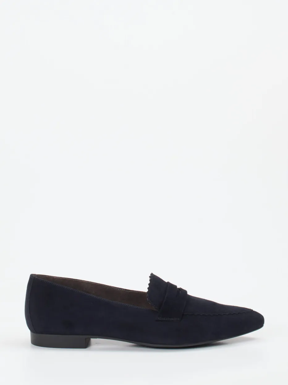 Zeitloser Stil trifft moderne Leichtigkeit.Paul Green präsentiert mit diesem Damen-Loafer ein stilvolles Modell für Alltag und Büro. Das samtig-matte Veloursleder in Dunkelblau unterstützt die spitz zulaufende Silhouette mit gezacktem Blatteinsatz und klassischer Penny-Zunge. Die flache, profilierte Gummisohle mit 1,5 cm Absatzhöhe sorgt gemeinsam mit dem ledernen Fußbett und weichem Futter für angenehmen Tragekomfort. Geprägt von Preppy Chic und Quiet Luxury, lässt sich das Design vielseitig kombinieren – etwa mit Stoffhose in Neutralfarben. Klare Linien, komfortable Leichtigkeit – Paul Green verbindet anspruchsvolles Design mit urbaner Tragbarkeit.