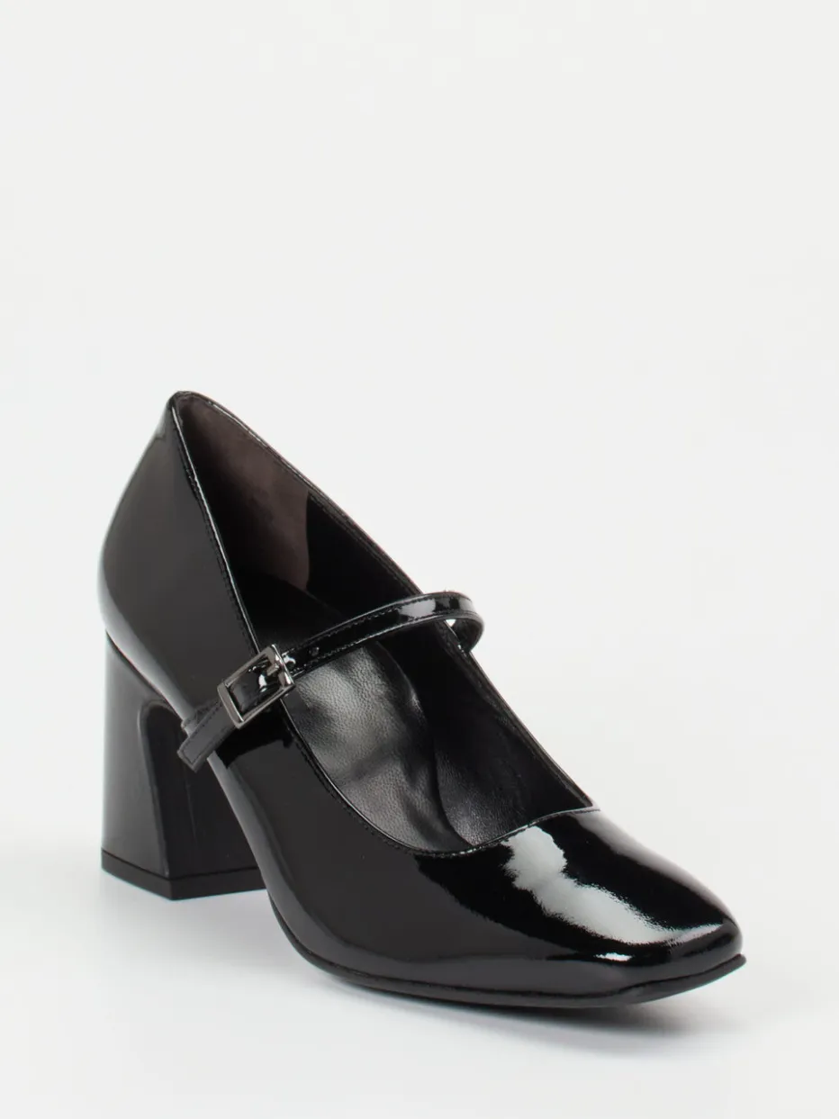 Mit glänzendem Lackleder und stilvoller Riemchenschnalle spiegeln diese Pumps den Retro-Femininity-Trend wider. Der bequeme Blockabsatz bietet darüber hinaus optimalen Tragekomfort.