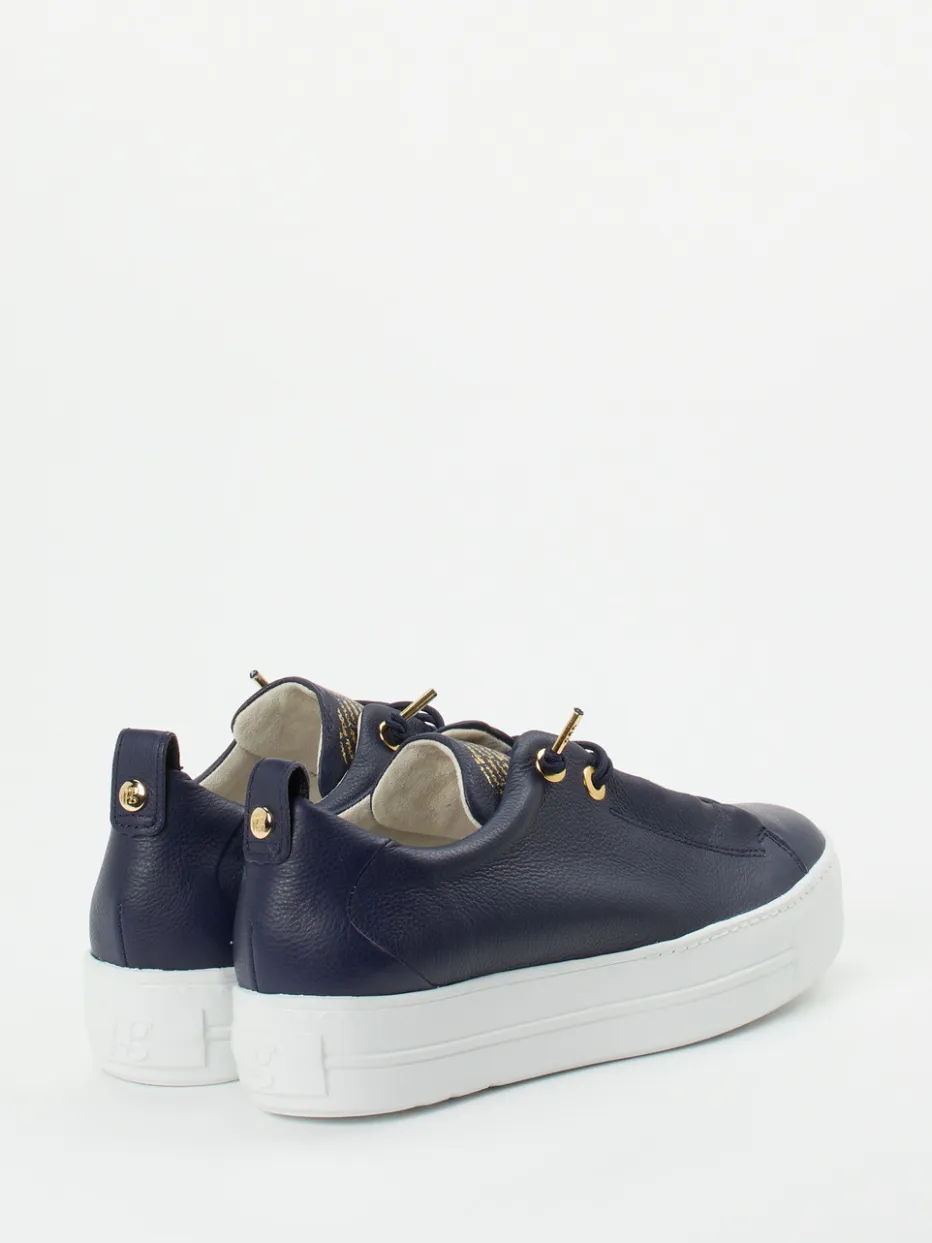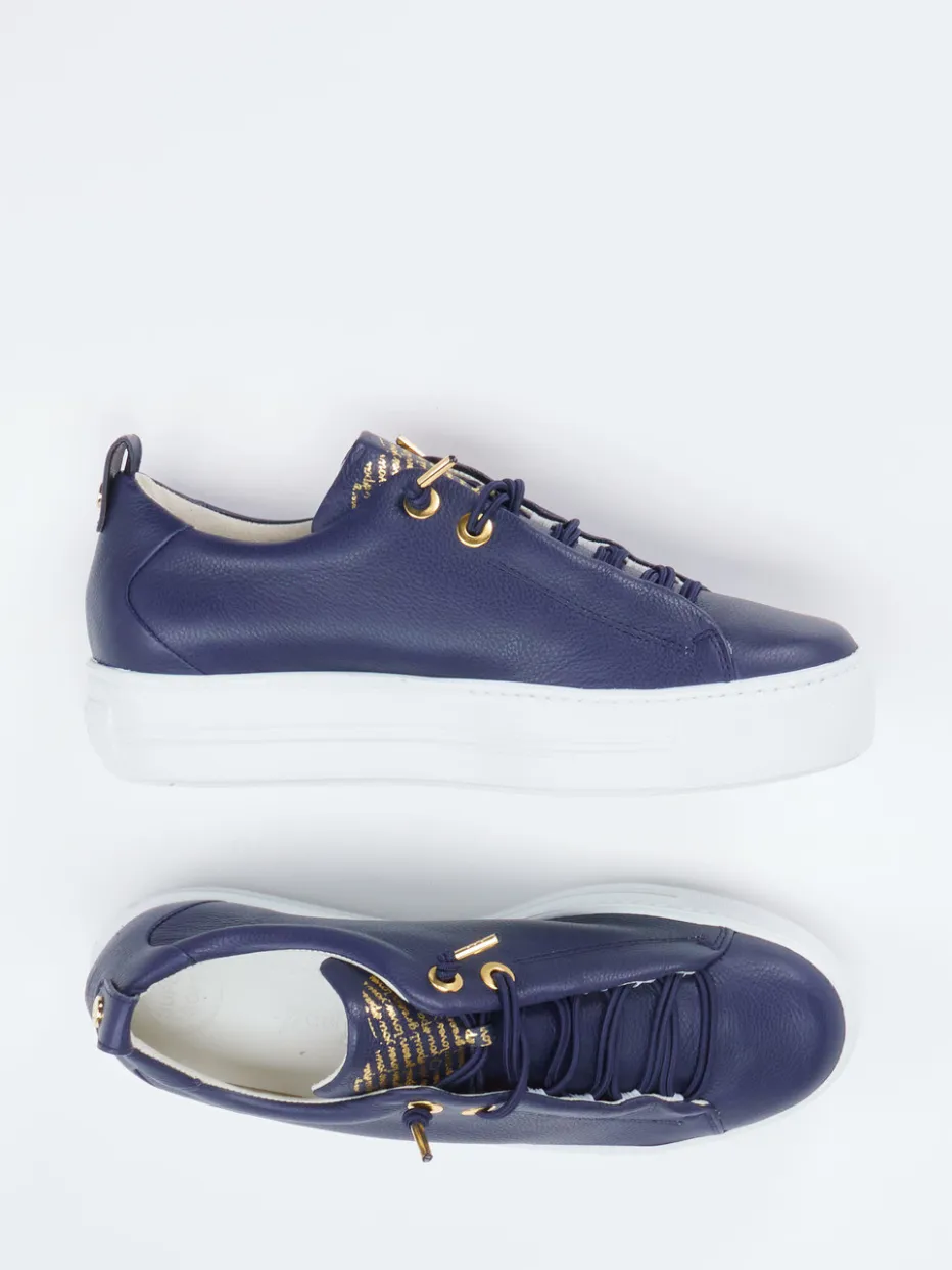 Ideal für ausgedehnte City-Touren oder entspannte Wochenenden überzeugt der Sneaker mit geschmeidigem Kalbleder in dunkelblauer, genarbter Optik. Goldfarbene Metallösen, eine bedruckte Zunge und eine praktische Zuglasche am Fersenbereich akzentuieren das klare Design. Die weiße Profilsohle aus Gummi sorgt für sicheren Halt und unterstreicht die moderne Plateau-Form, während die elastische Schnürung Komfort und Flexibilität bietet. Der Look passt perfekt zu minimalistischer Streetwear und lässigen Alltagsoutfits.