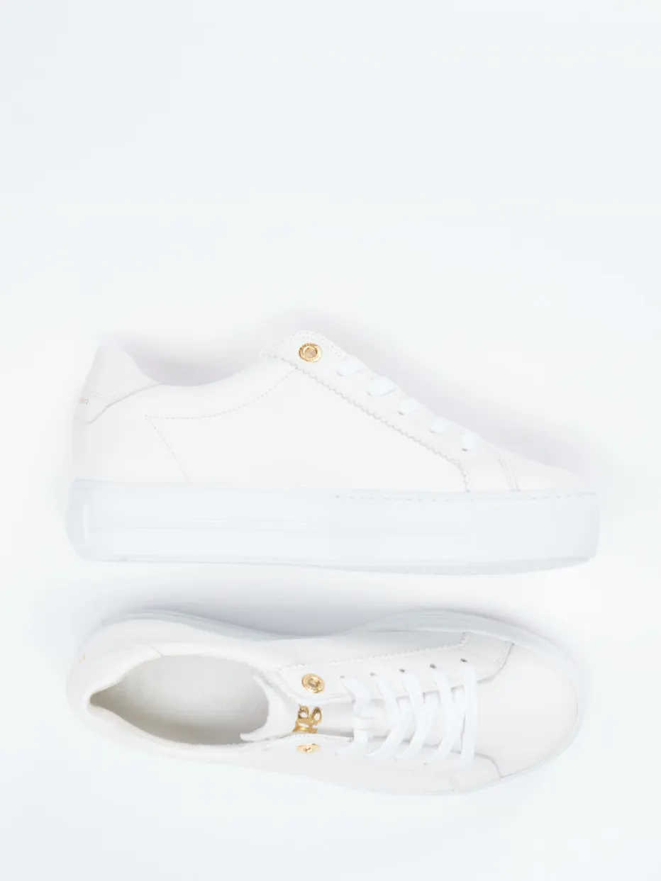 Hochwertiges Kalbleder mit feiner Narbung und goldfarbenen Details verleiht diesem Sneaker einen modernen, puristischen Look. Die erhöhte Gummisohle sorgt für angenehmen Laufkomfort.