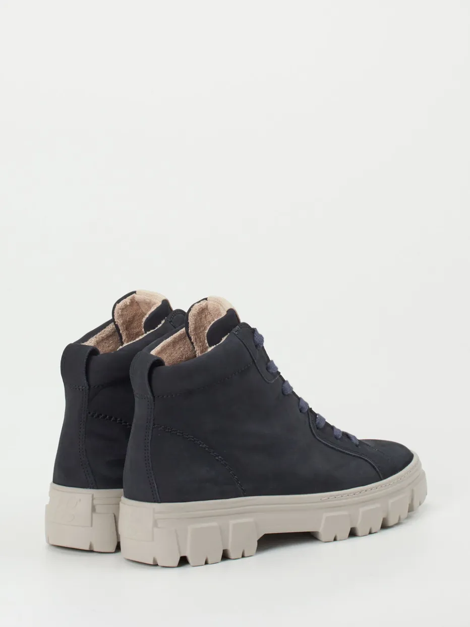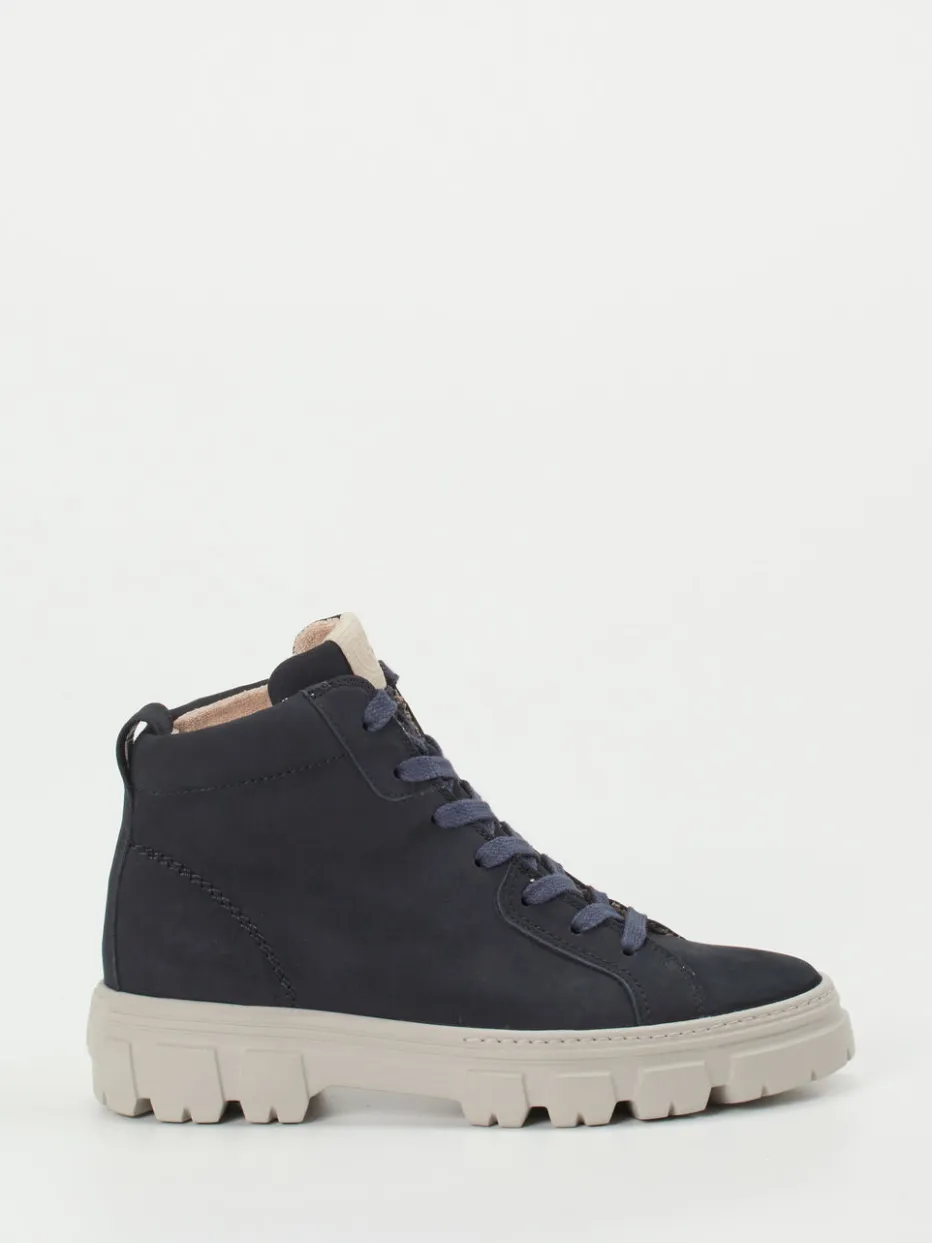Alltagstauglich mit urbaner Stärke. Paul Green präsentiert modische Damen-Schnürboots für die kühle Saison. Ob beim Stadtbummel oder auf dem Weg ins Büro – das weiche Nubukleder in Dunkelblau sorgt mit matter Oberfläche und tonalen Ziernähten für ein stilvolles Auftreten. Die knöchelhohe, rund zulaufende Form trifft auf eine profilierte Chunky-Sohle in Beigegrau, deren hohe Lauffläche sicheren Halt bietet. Innen überzeugt der Schuh mit kuscheligem Frotteefutter. Zuglasche und Logo-Detail runden das Design ab. Inspiriert von Streetwear und Utility-Trends eignet sich das Modell ideal zu lässigen Oversize-Mänteln oder Outdoor-Jacken. Paul Green steht für modernen Komfort mit Anspruch an Alltagstauglichkeit und Stil.