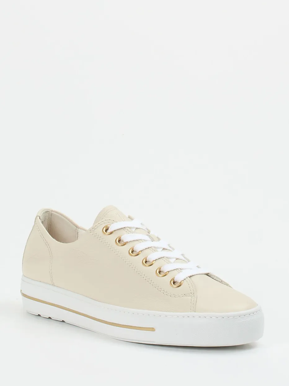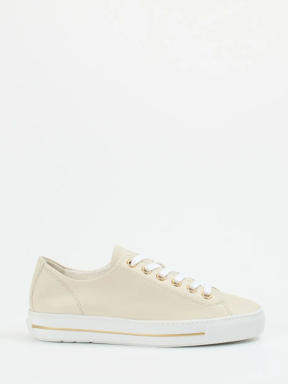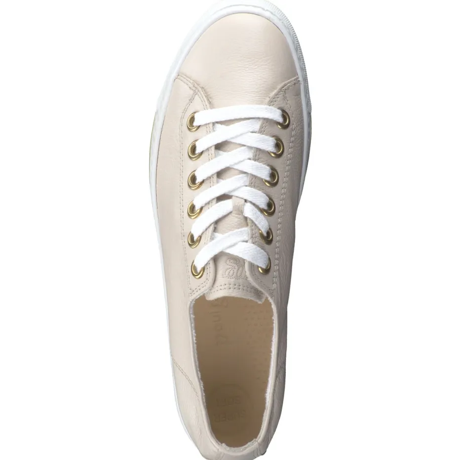 Komfort auf ganzer Linie verspricht dieser lässige, schlichte Sneaker der Marke Paul Green. Das beigefarbene Kalbleder wird durch die weiße Sneakersohle mit dem goldfarbenen Streifen dekorativ kontrastiert. Die blütenweißen Schnürbänder unterstreichen zusätzlich den sportiven Charakter des Sneakers. Dank des weichen Frotteefutters und der extrasoften Innensohle ist ein angenehmes Tragegefühl garantiert. Ein toller Sneaker für viele Gelegenheiten!