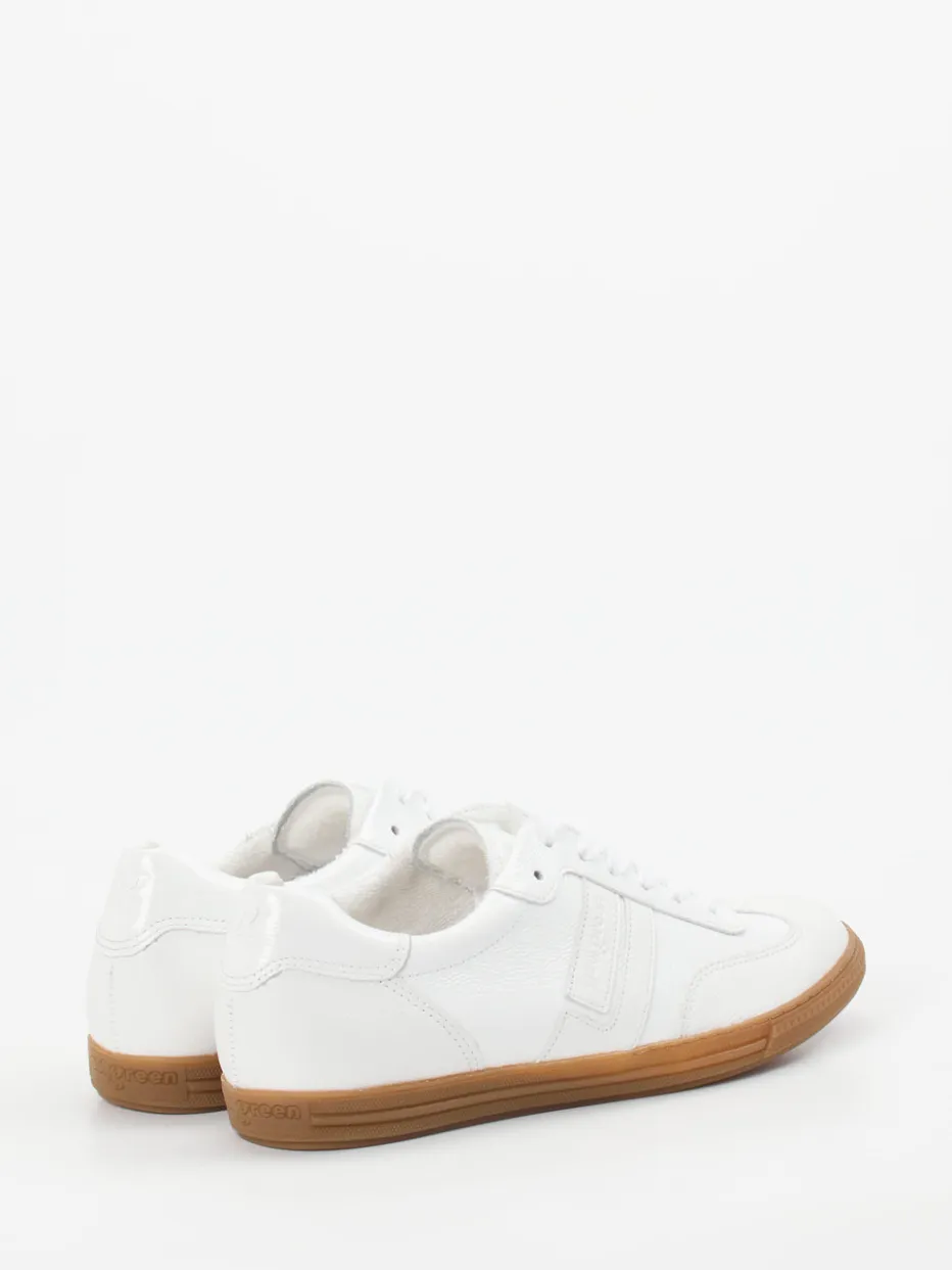 Stilvoller Allrounder mit Retro-Charakter.Paul Green präsentiert mit diesem Low-Top-Sneaker ein Modell aus weißem Lackleder mit fein genarbten Lederoverlays. Ideal für entspannte Alltagssituationen verbindet der Sneaker hochwertiges, glänzendes Lackleder mit samtigen Strukturkontrasten an Ferse und Seitenteilen. Die flache, schmale Silhouette wird durch die karamellfarbene Gummisohle im Retro-Stil betont. Ton-in-Ton-Nähte, geprägtes Außenbranding und strapazierfähige Schnürung ergänzen das minimalistische Design. Inspiriert von Quiet Luxury und Retro-Sportswear trifft er den Trend der Saison. Ob zu Jeans oder Basics: ein stilvoller Akzent für jeden Casual-Look. Hochwertige Verarbeitung trifft auf stilistische Zurückhaltung – ganz im Sinne von Paul Green.