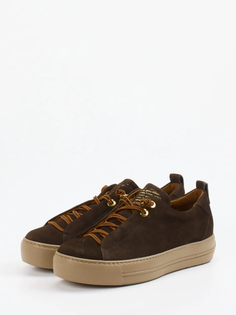 Komfort trifft auf Understatement.Paul Green präsentiert mit diesem Damen-Sneaker ein Modell, das Stilbewusstsein und Alltagstauglichkeit mühelos vereint. Ob zu langen Bürotagen oder herbstlichen City-Spaziergängen – das samtig angeschliffene Nubukleder in tiefem Dunkelbraun bietet angenehmen Tragekomfort und maximale Kombinierbarkeit. Goldfarbene Ösen und tonige Nähte setzen elegante Akzente, während die taupefarbene Plateausohle mit 3,5 cm Höhe für eine moderne Silhouette sorgt. Die abgerundete Form, elastische Schnürung und Logo-Details auf Zunge und Ferse unterstreichen den urban-minimalistischen Charakter. Perfekt zu Naturtönen, Kaschmir oder Lederaccessoires. Ein Sneaker mit Stilautorität und Wohlfühlfaktor – typisch Paul Green.