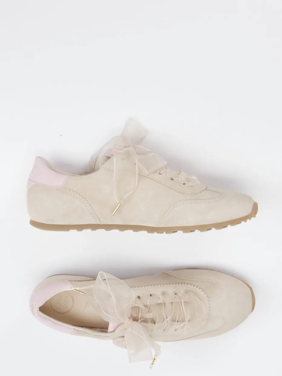 Verspielter Retro-Charme in Pastelltönen. Paul Green präsentiert mit diesem Damen-Sneaker einen stilvollen Begleiter für spontane City-Touren oder entspannte Frühlingsmomente. Der aus Veloursleder gearbeitete Freizeitschuh zeigt sich in hellem Cremebeige mit pastellrosa Akzenten und glänzenden Logodetails. Die matte Oberfläche, die flache, schmale Silhouette sowie die Organza-Schnürsenkel sorgen für ein expressives Zusammenspiel aus Retro-Attitüde und femininer Leichtigkeit. Eine Gummisohle rundet den modischen Look funktional ab. Trendig inszeniert im Y2K-Stil und perfekt für zarte Stylings mit cropped Jeans und Ankle-Socks. Feminin, verspielt und modisch – ein Sneaker mit der Handschrift von Paul Green.