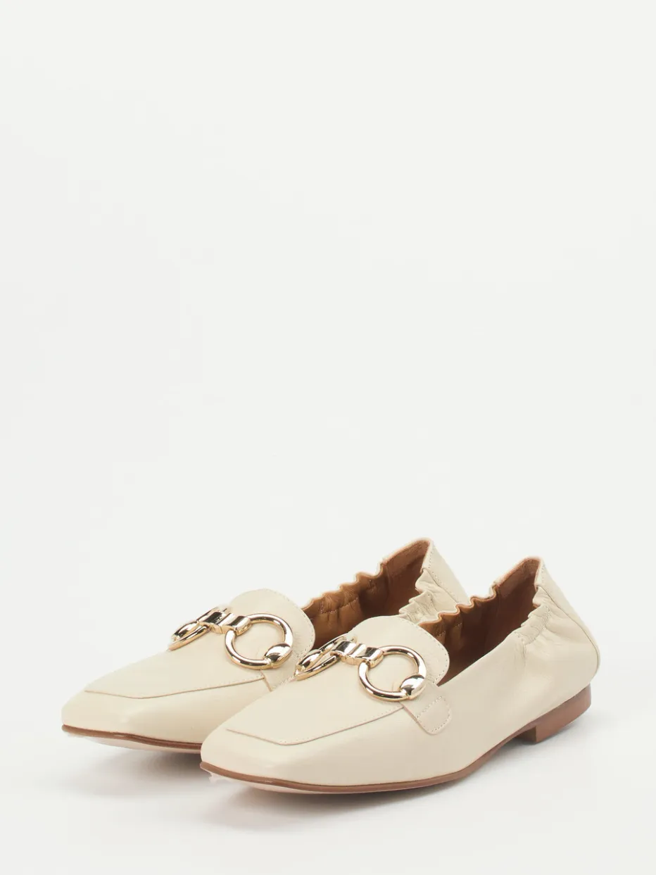 Ob im Büro oder beim Stadtbummel – dieser cremebeige Loafer erfüllt das Bedürfnis nach komfortabler Eleganz. Gefertigt aus Kalbleder mit matter Oberfläche bietet er eine geschmeidige Haptik. Akzente setzt die goldfarbene Zierschnalle auf dem Spann, ergänzt durch feine Steppnähte und einen elastischen Fersenbereich. Die flache Silhouette mit 1 cm Absatz und die Ledersohle unterstreichen stilvolle Zurückhaltung im Sinne von „Quiet Luxury“. Ideal kombinierbar mit Hosenanzügen oder Midikleidern.