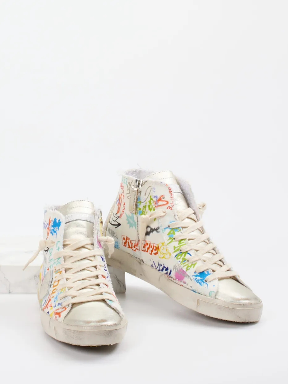 Streetwear trifft Pariser Nonchalance.Philippe Model erweitert mit diesem High-Top Sneaker die Damenkollektion um ein expressives Designstück. Ein idealer Begleiter bei Freizeitaktivitäten oder abendlichem Ausgehen: Der mehrfarbige Sneaker aus Textil zeigt sich mit glitzernden Partien, silberner Metallic-Lederkappe und einem markanten Graffiti-Print. Der hohe Schnitt wirkt klassisch, während Details wie das seitliche Markenwappen und die Vintage-Gummisohle die urbane Ausstrahlung unterstreichen. Ein innenliegender Reißverschluss erleichtert das An- und Ausziehen. Inspiriert von Streetstyle und Y2K-Trends, passt er hervorragend zu Oversized-Hoodies oder Destroyed Jeans. Ein Design voller Energie – exzentrisch, selbstbewusst und unverkennbar Philippe Model.