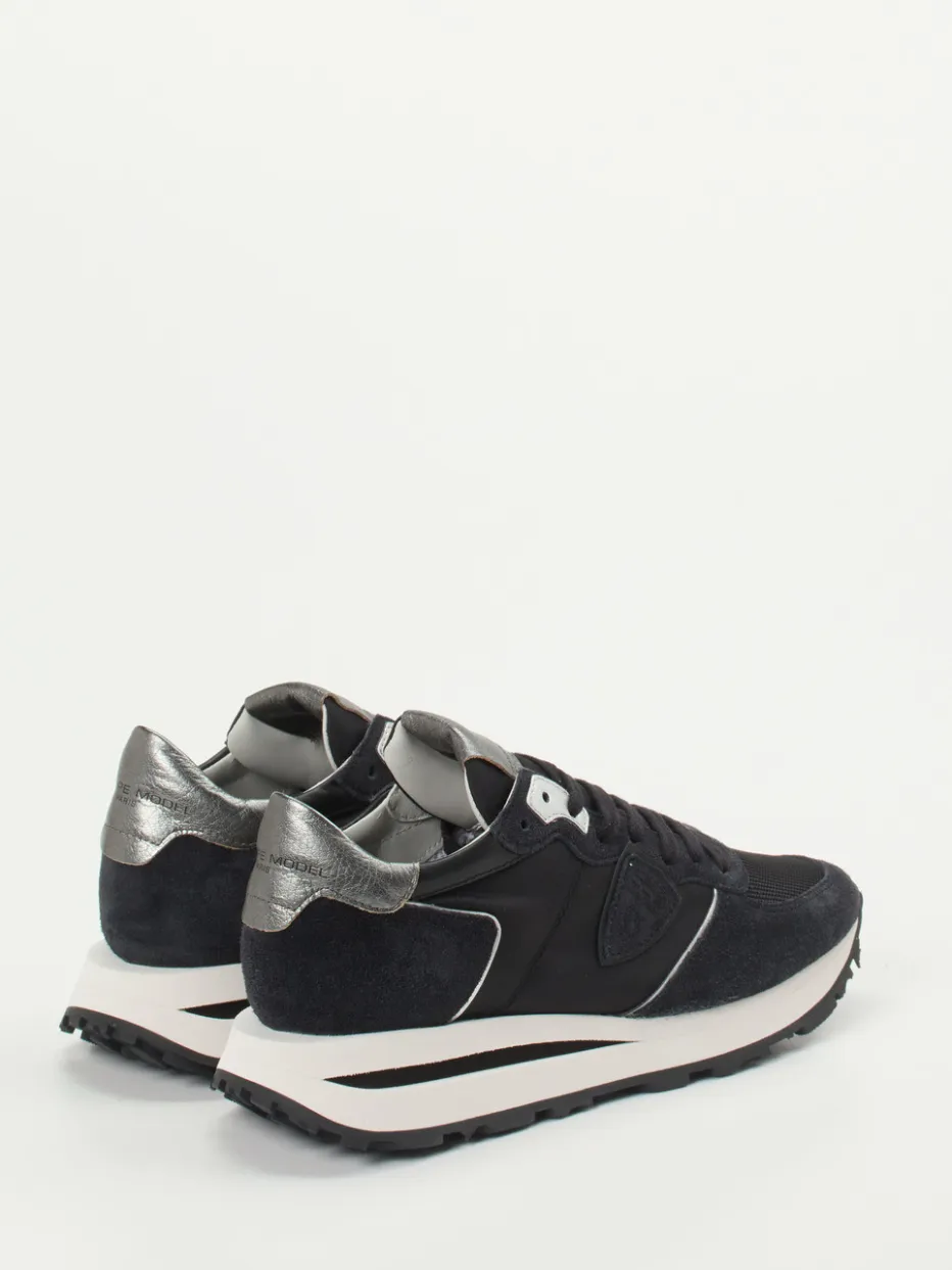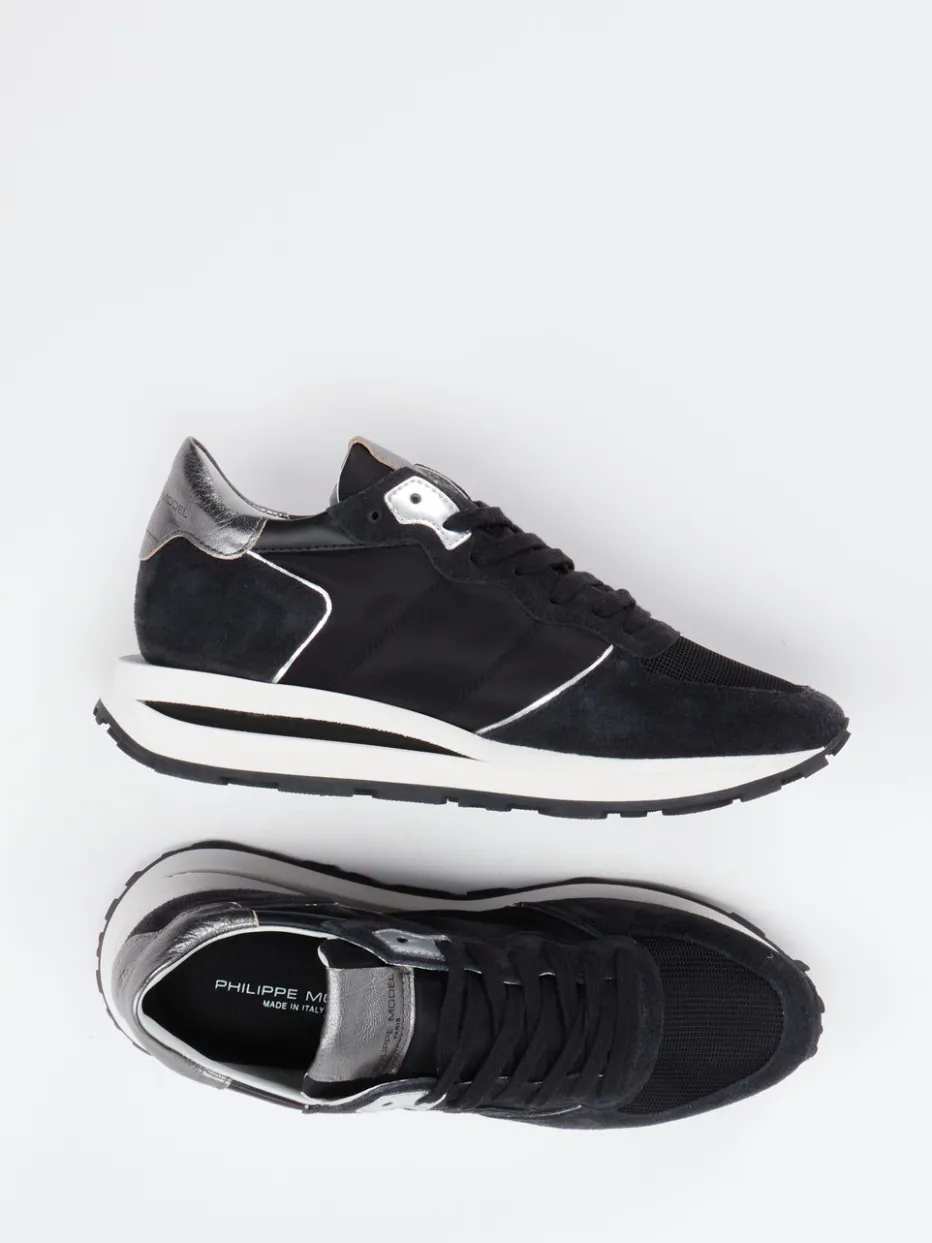 Retro trifft modernen Streetstyle.Philippe Model interpretiert den klassischen Retro-Sneaker in sportlich-eleganter Weise. Ideal für urbane Alltagsmomente überzeugt das Modell durch einen hochwertigen Materialmix aus samtig angeschliffenem Veloursleder, luftigem Meshgewebe und silbernem Glattleder mit Metallic-Finish. Die tiefschwarze Farbgebung wird durch silberne Highlights und eine schwarz-weiße Kontrastsohle dynamisch akzentuiert. Eine gepolsterte Zunge, Profilgummisohle und weiches Frotteefutter mit Memory-Foam sorgen für Komfort. Als Teil des aktuellen „Metallic Accents“-Trends eignet sich der Sneaker besonders für trendorientierte Looks. Markentypisch stilvoller Komfort mit sportiver Präzision.
