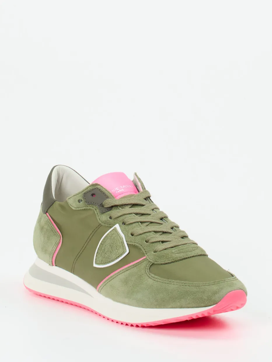 Urbaner Retro-Look mit Neon-Twist.Philippe Model interpretiert den Retro-Runner neu und präsentiert diesen Sneaker in modernem Materialmix. Ideal für trendorientierte City-Styles vereint das Modell strukturiertes Veloursleder mit matt schimmerndem Nylon in Olivgrün. Neonpinke Kontrastdetails, reflektierende Logo-Elemente und eine Gummisohle in Statement-Farbe unterstreichen den sportiven Charakter. Die gepolsterte Zunge, ein angenehm weiches Innenfutter sowie die stabile Schnürung sorgen für Komfort und Halt. Inspiriert vom Y2K-Revival begeistert dieser Sneaker als modernes Streetwear-Piece. Stilpolitik trifft Komfort – französisches Design mit urbaner Substanz.