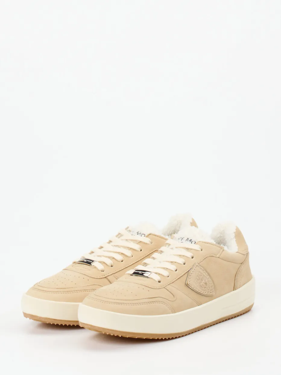 Ideal für kalte Tage mit hohem Komfortanspruch: Das sandfarbene Nubukleder wirkt samtig-matt und harmoniert mit dem beigem Gesamtbild. Die klassische Low-Top-Silhouette ist fein abgerundet, metallische Logo-Details setzen dezente Akzente. Innen sorgt flauschiges Kunstfell für wohltuende Wärme. Die strapazierfähige Gummisohle mit Fischgrätprofil ist leicht und stoßdämpfend, die Schnürung bietet sicheren Halt. Ein modisches Highlight im Zeichen des „Quiet Luxury“-Trends, perfekt zu Naturtönen oder Oversized-Hoodies.