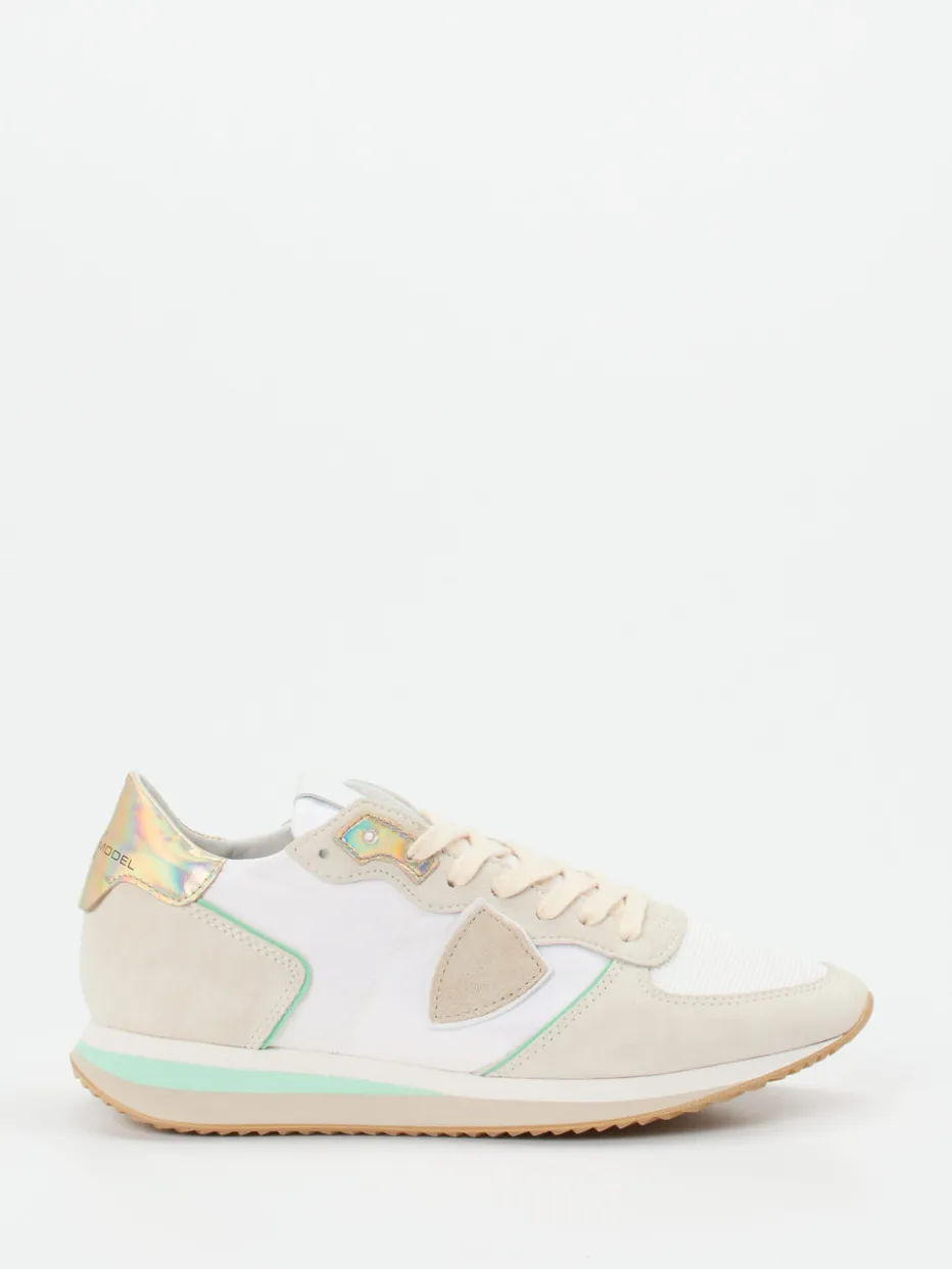 Leichtigkeit im Vintage-Stil.Philippe Model zeigt hier einen unisex Retro-Sneaker, der sportliche Eleganz und modischen Anspruch verbindet. Ideal für entspannte Sommertage: Der Sneaker besteht aus hochwertigem Veloursleder, ergänzt durch Mesh und weißes Nylon. Die Farbgebung in Beige, Weiß und Mintgrün sorgt für sommerliche Frische, während irisierende Metallic-Overlays an Ferse und Ösen dezente Highlights setzen. Dank der flachen und schmal gehaltenen Form, profilierter Gummisohle sowie gepolstertem Innenbereich bietet er Komfort und Leichtigkeit. Inspiration liefert der 90er-Jahre-Stil, kombiniert mit aktueller Streetwear-Attitüde – passend zu Canvas-Cap und Crossbody-Bag. It-Piece für trendbewusste Looks mit französischem Esprit.